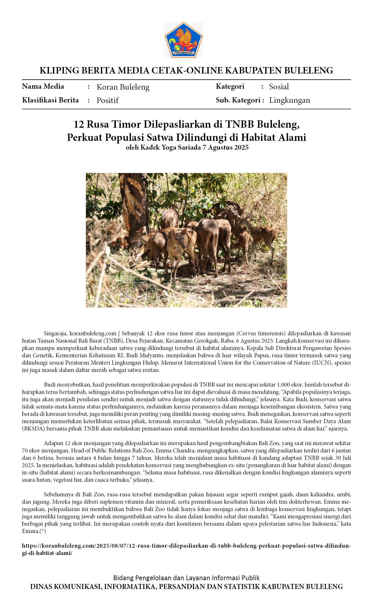 12 RUSA TIMOR DILEPASLIARKAN DI TNBB BULELENG, PERKUAT POPULASI SATWA DILINDUNGI DI HABITAT ALAMI