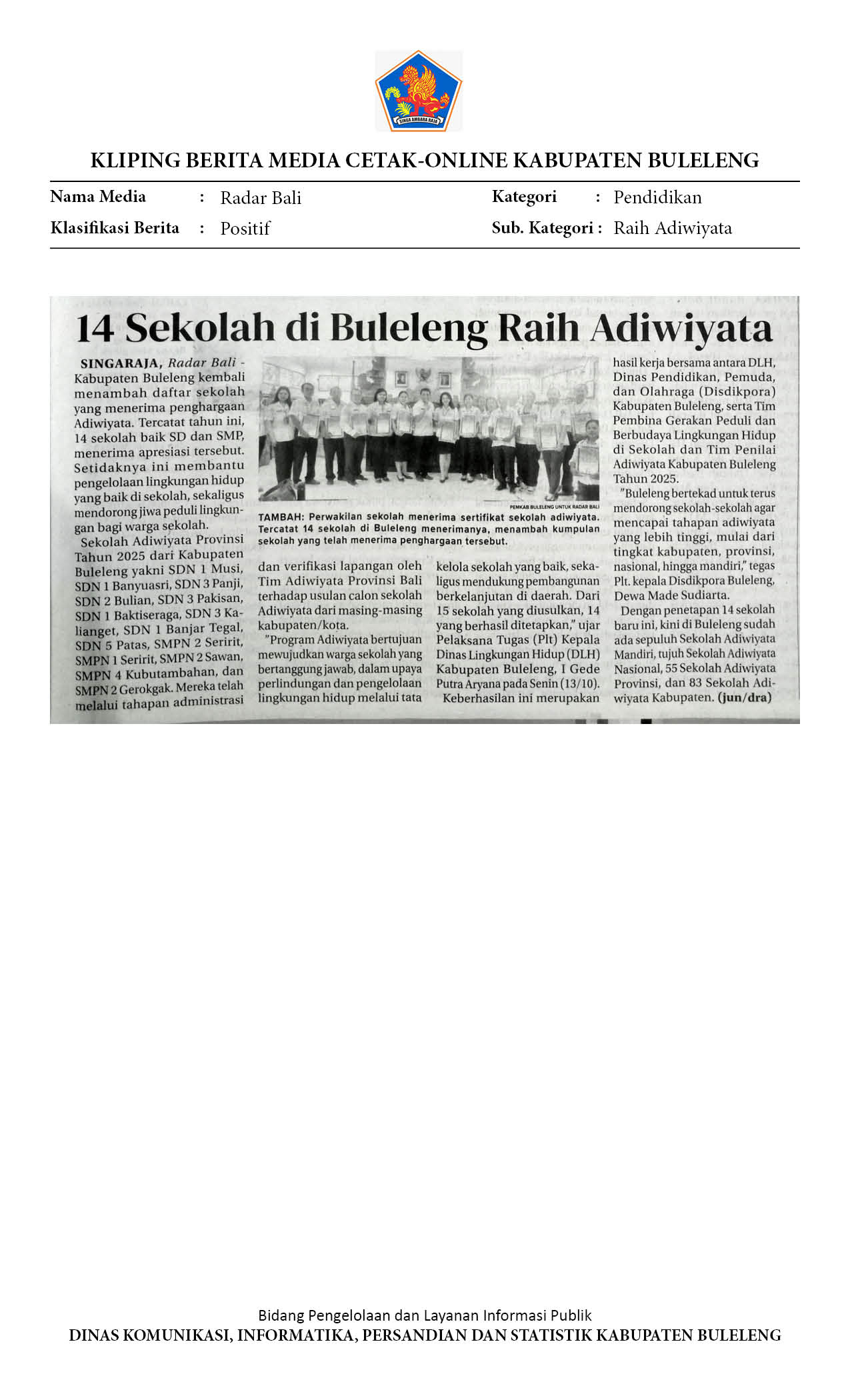 14 SEKOLAH DI BULELENG RAIH ADIWIYATA