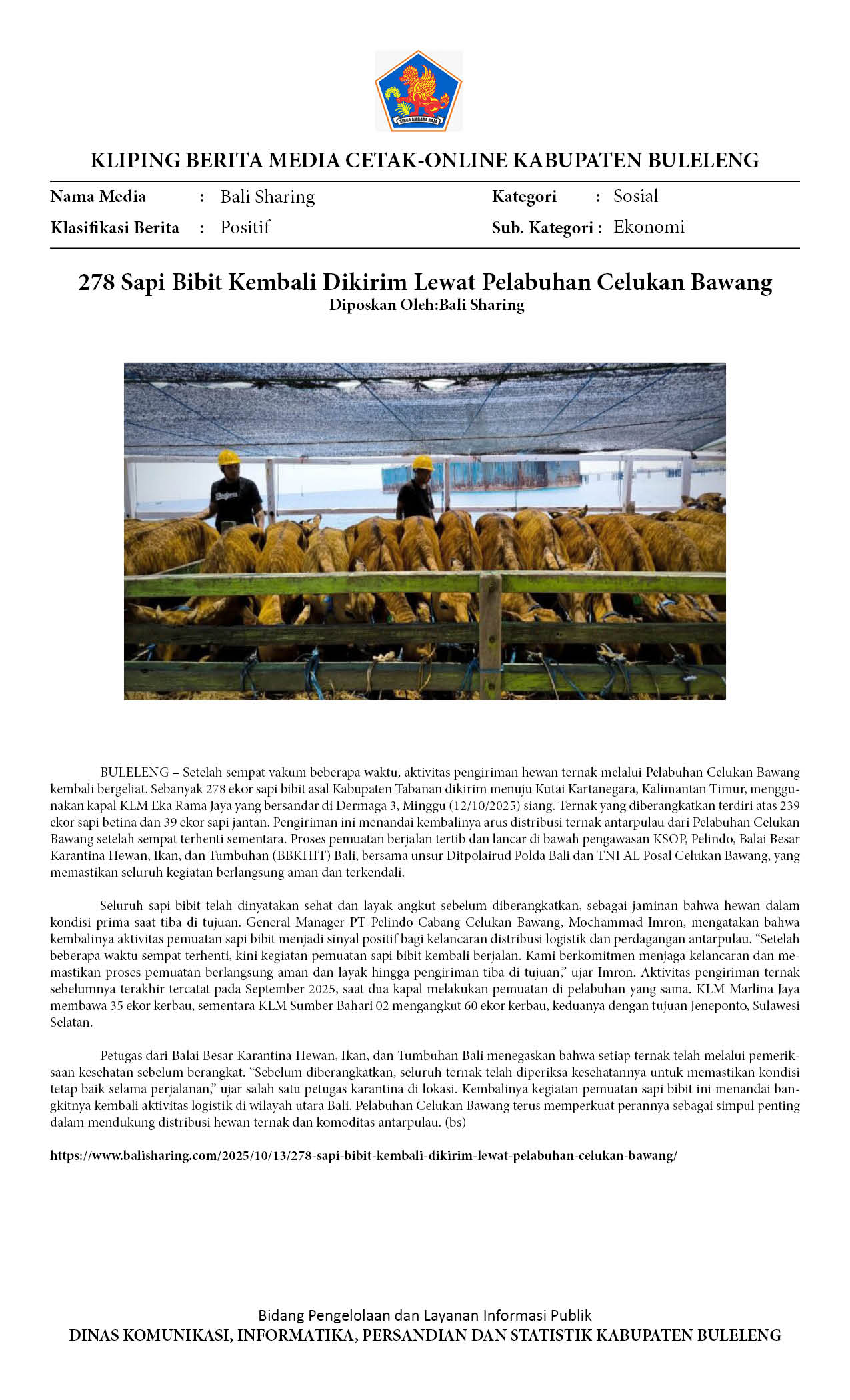 278 SAPI BIBIT KEMBALI DIKIRIM LEWAT PELABUHAN CELUKAN BAWANG