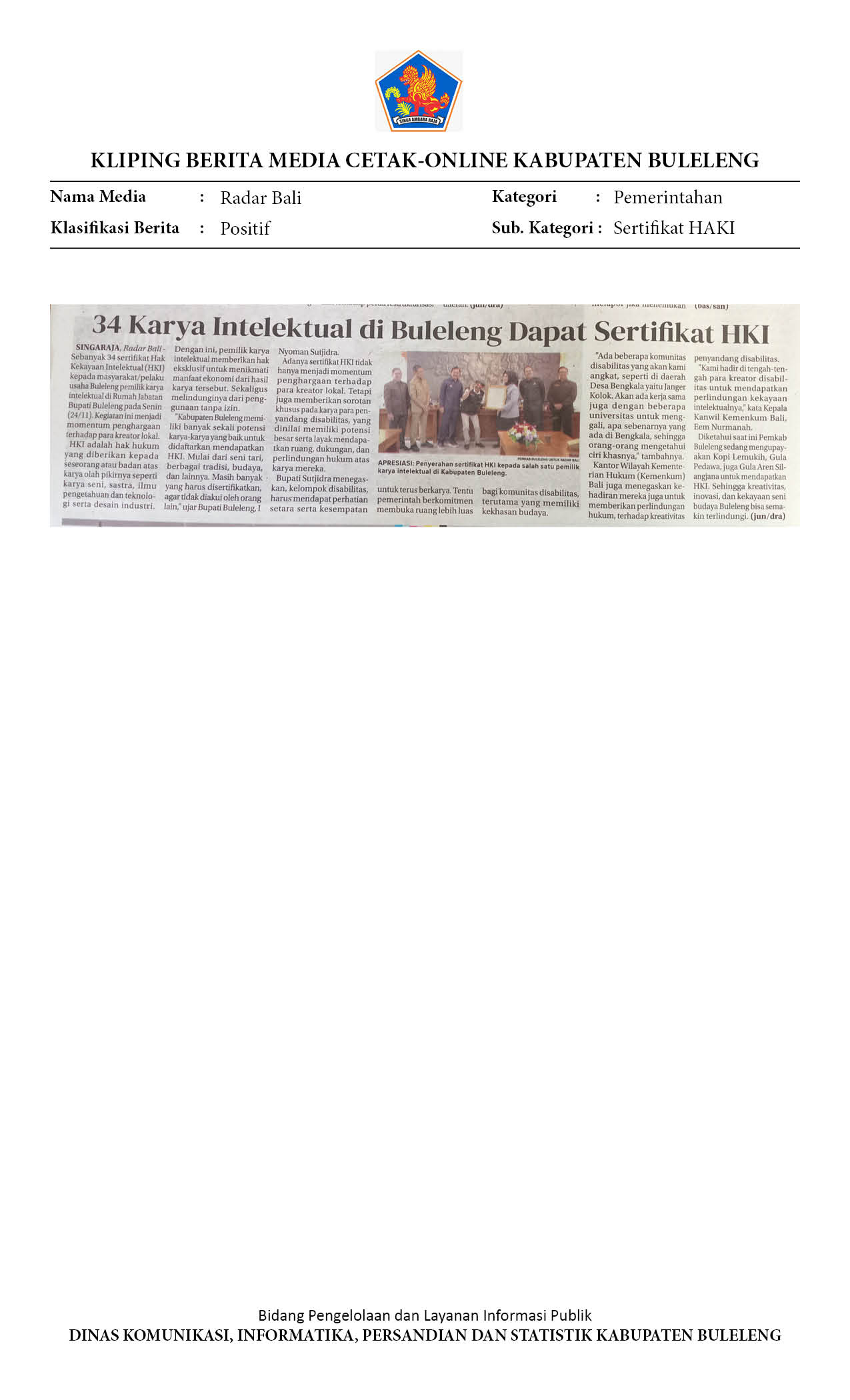 34 KARYA INTELEKTUAL DI BULELENG DAPAT SERTIFIKAT HKI