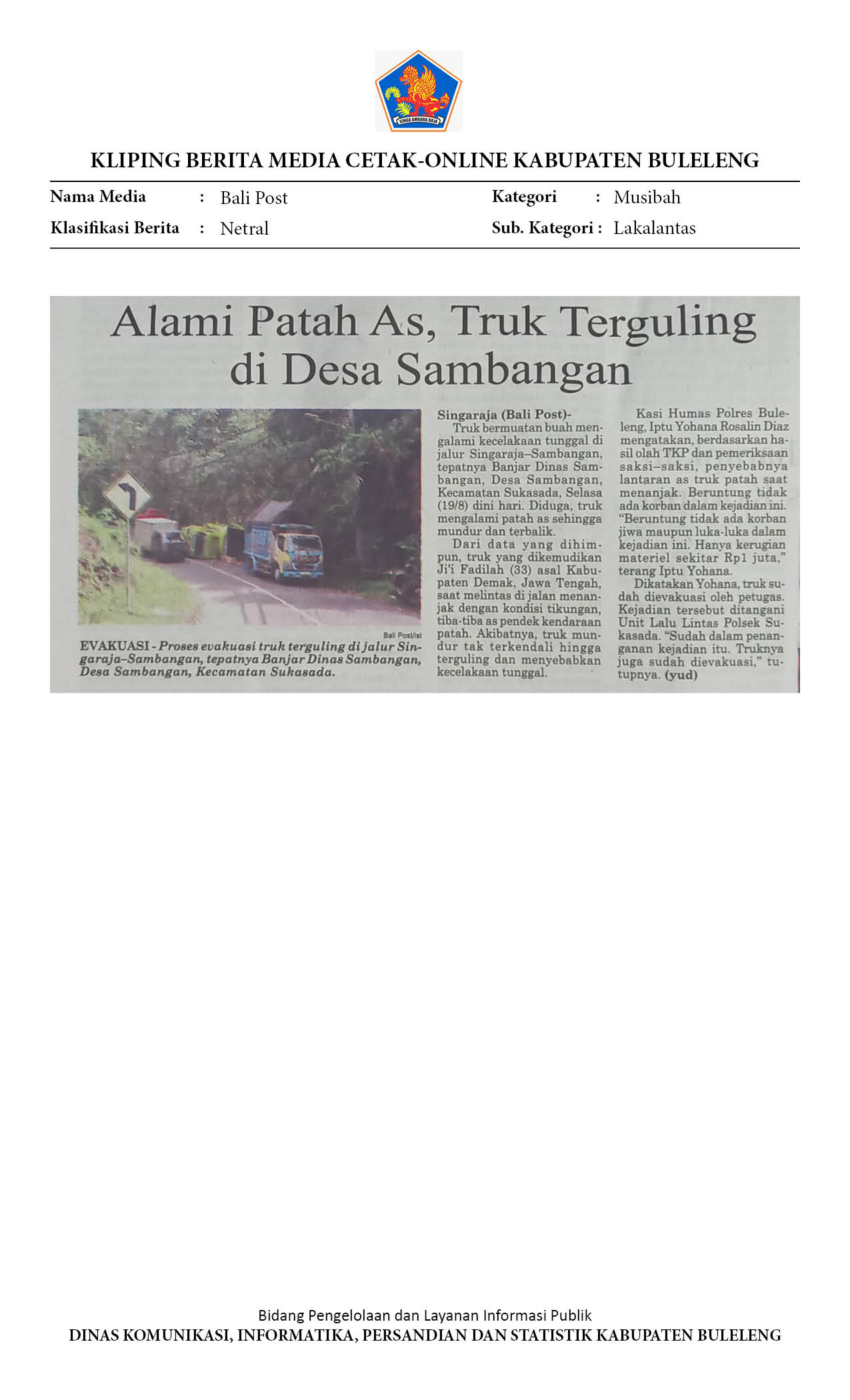 ALAMI PATAH AS, TRUK TERGULING DI DESA SAMBANGAN