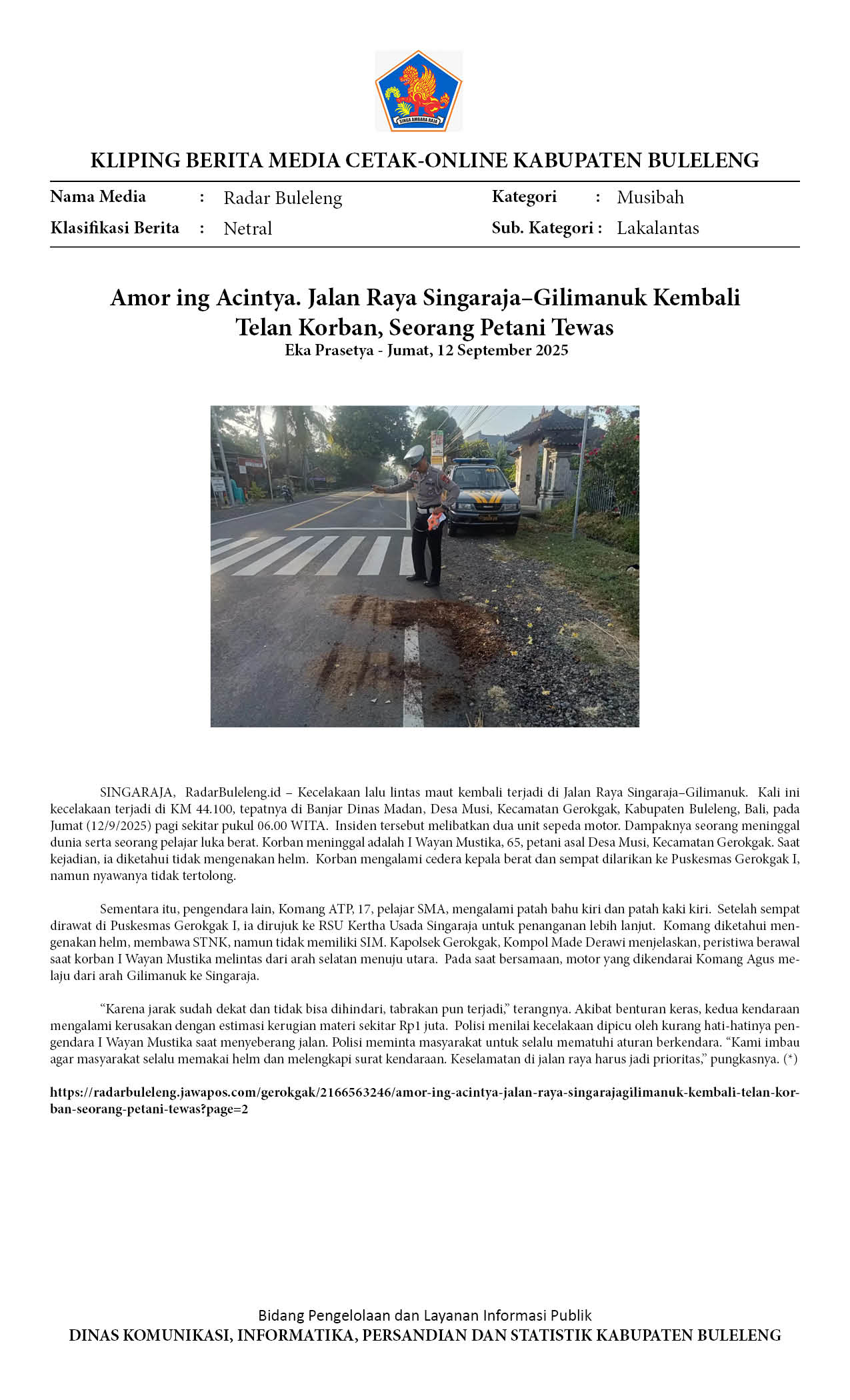 AMOR ING ACINTYA. JALAN RAYA SINGARAJA–GILIMANUK KEMBALI TELAN KORBAN, SEORANG PETANI TEWAS