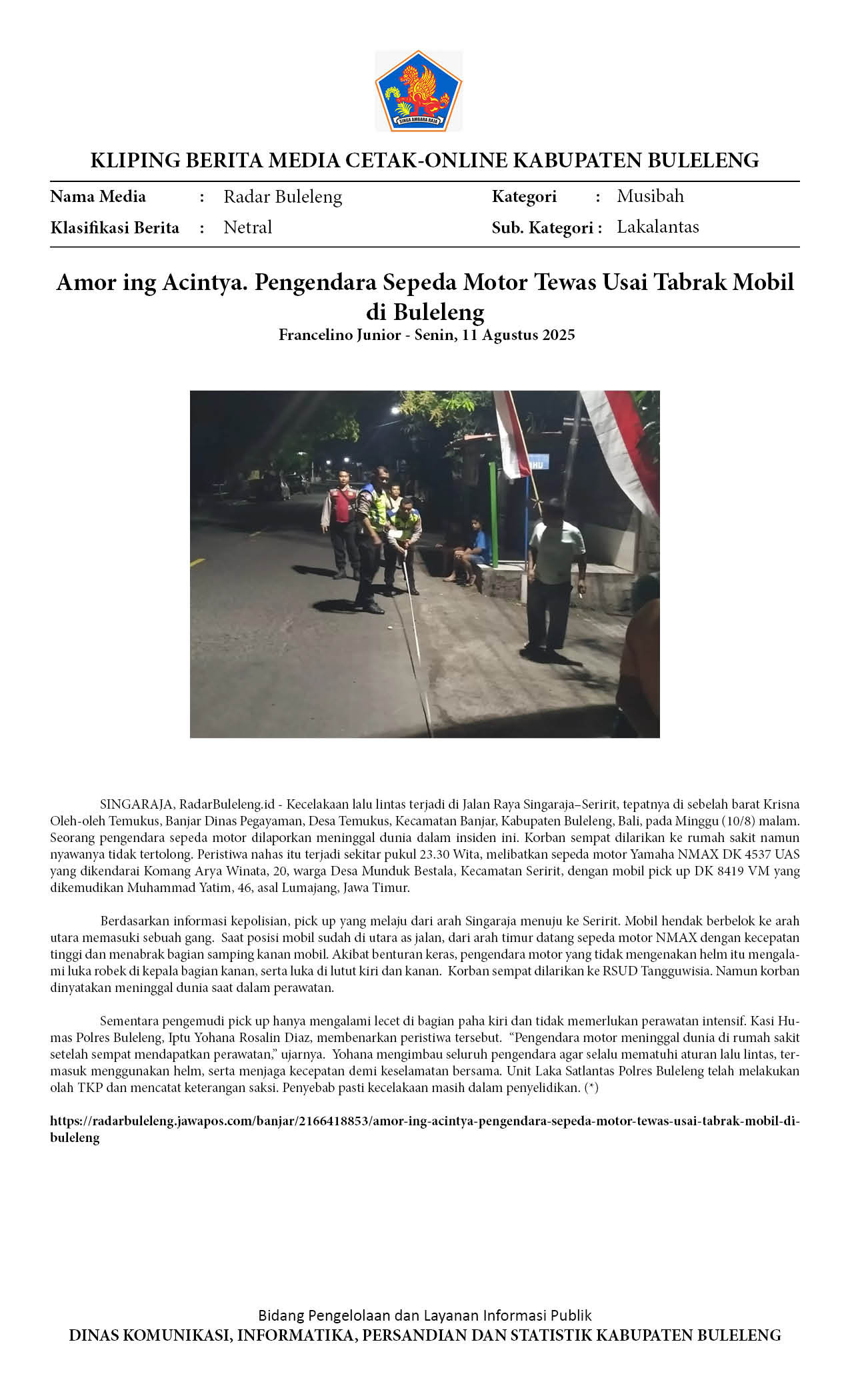 AMOR ING ACINTYA. PENGENDARA SEPEDA MOTOR TEWAS USAI TABRAK MOBIL DI BULELENG