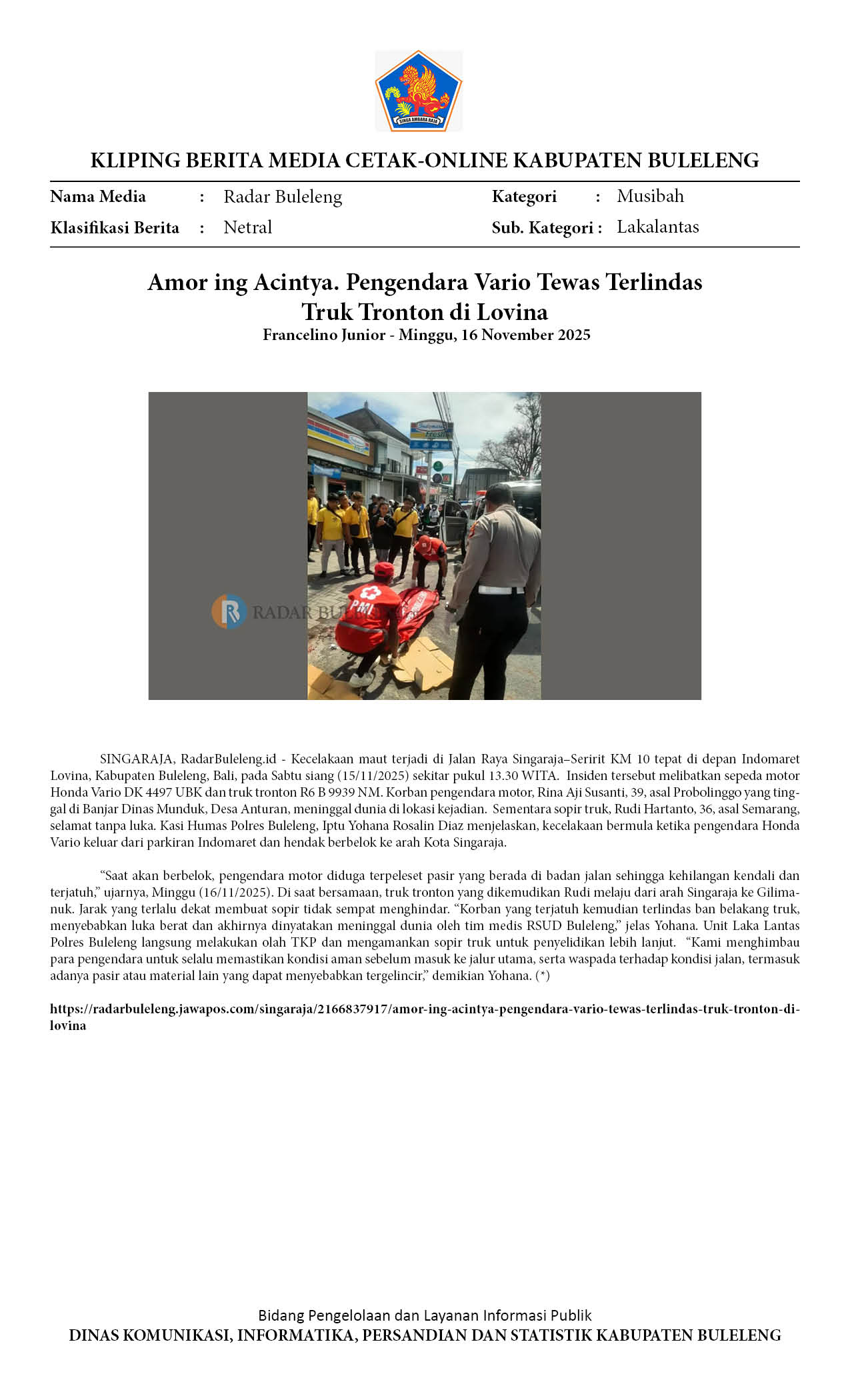 Amor ing Acintya. Pengendara Vario Tewas Terlindas Truk Tronton di Lovina