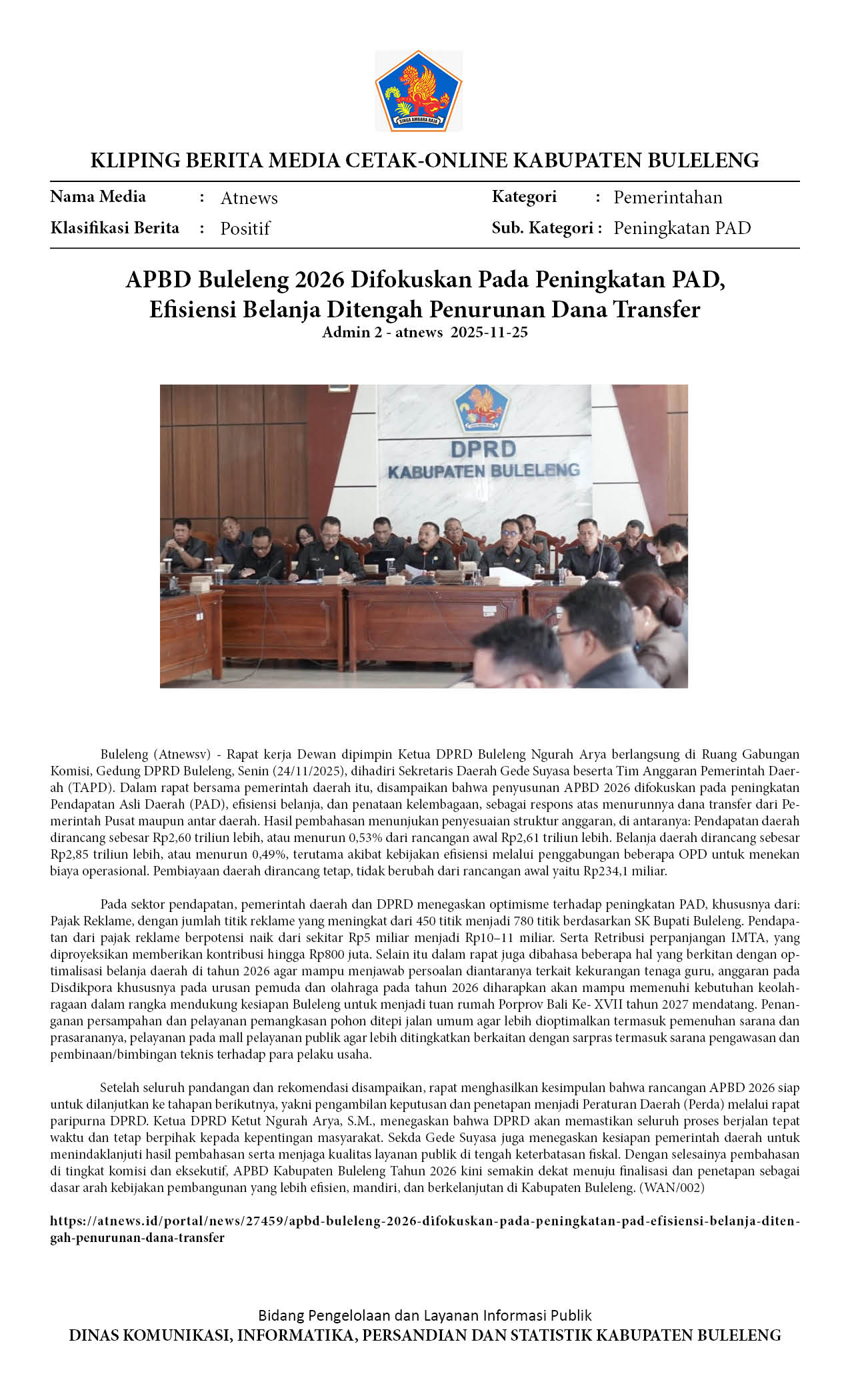 APBD BULELENG 2026 DIFOKUSKAN PADA PENINGKATAN PAD, EFISIENSI BELANJA DITENGAH PENURUNAN DANA TRANSFER