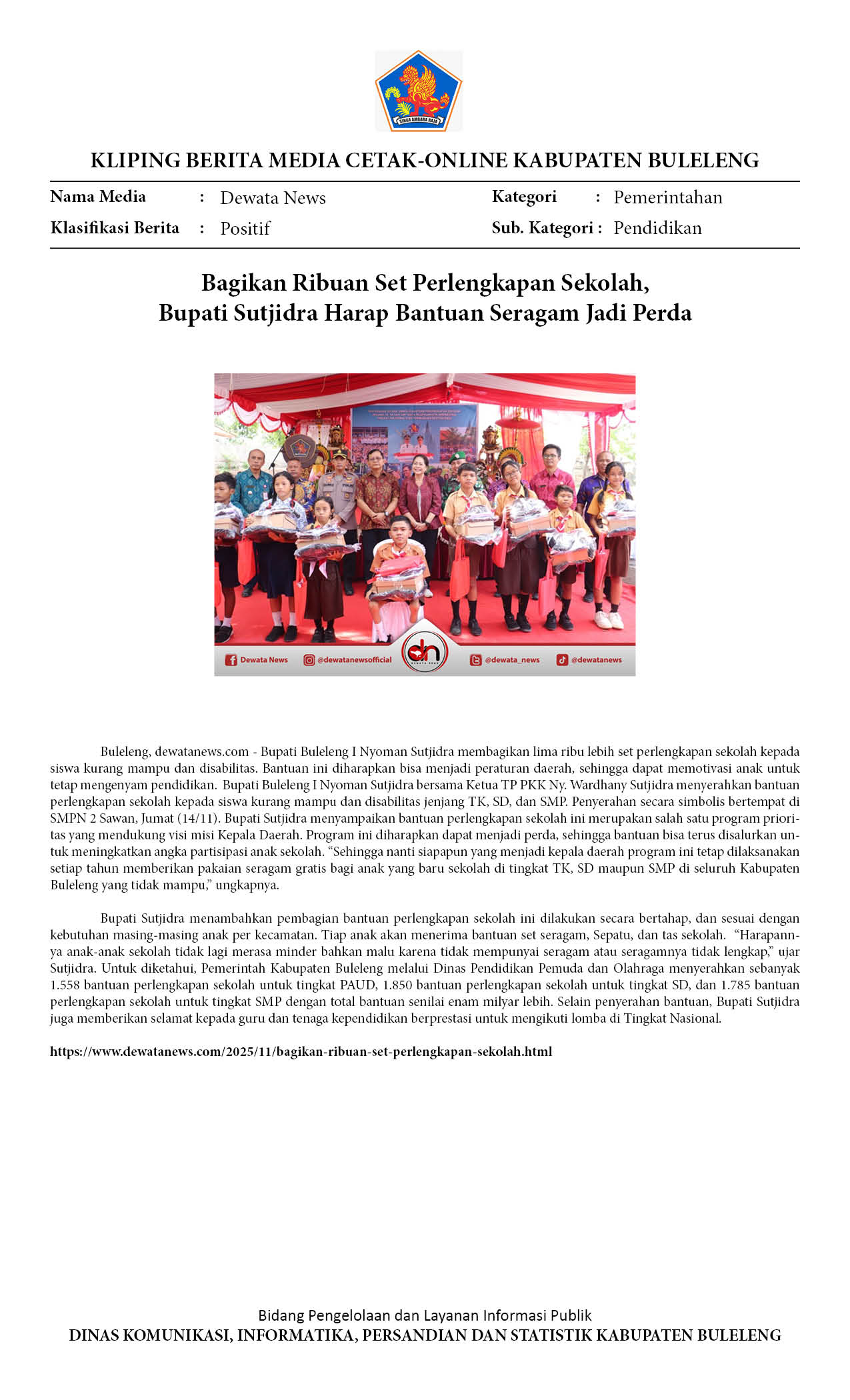 Bagikan Ribuan Set Perlengkapan Sekolah, Bupati Sutjidra Harap Bantuan Seragam Jadi Perda