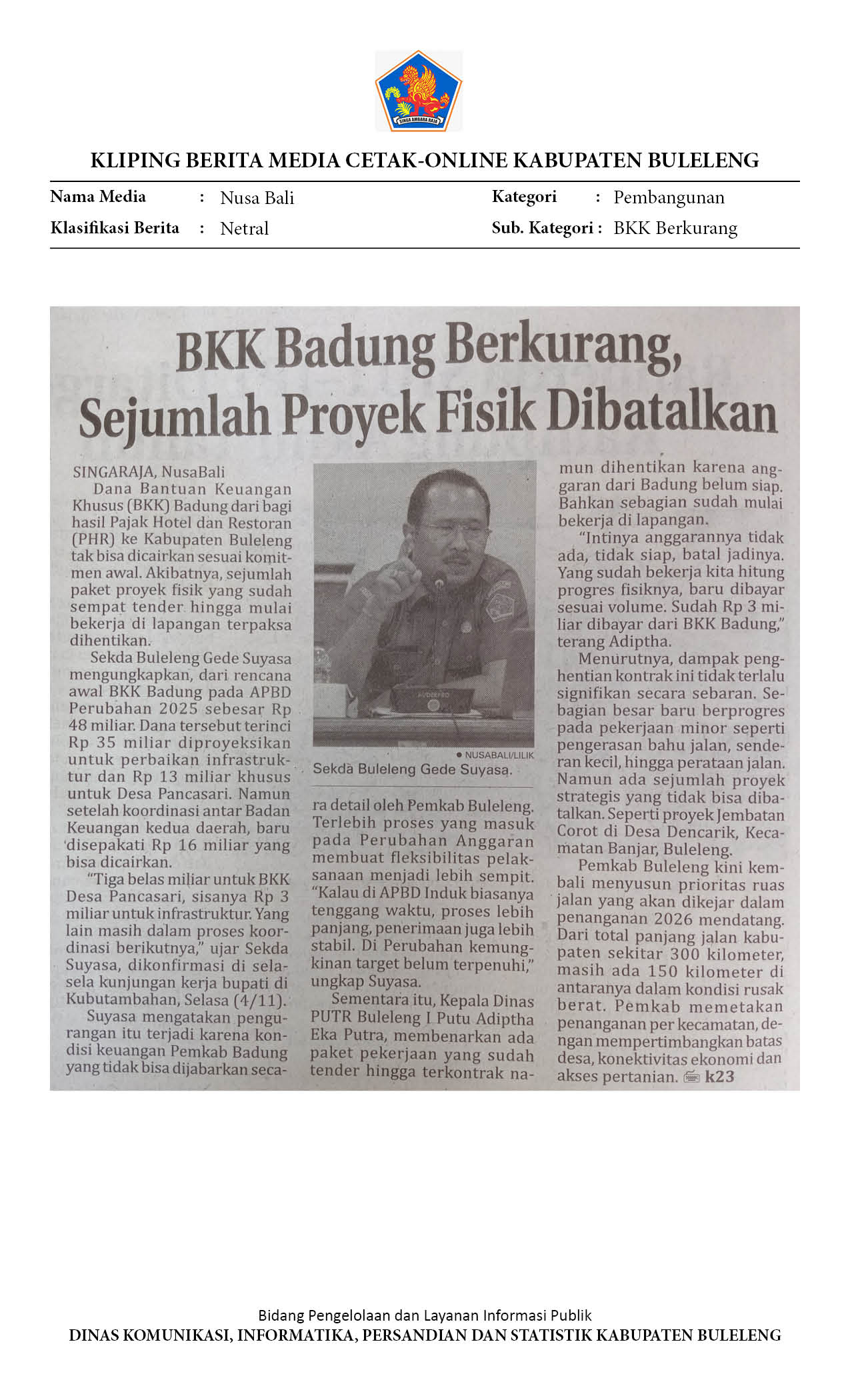 BKK Badung Berkurang, Sejumlah Proek Fisik Dibatalkan