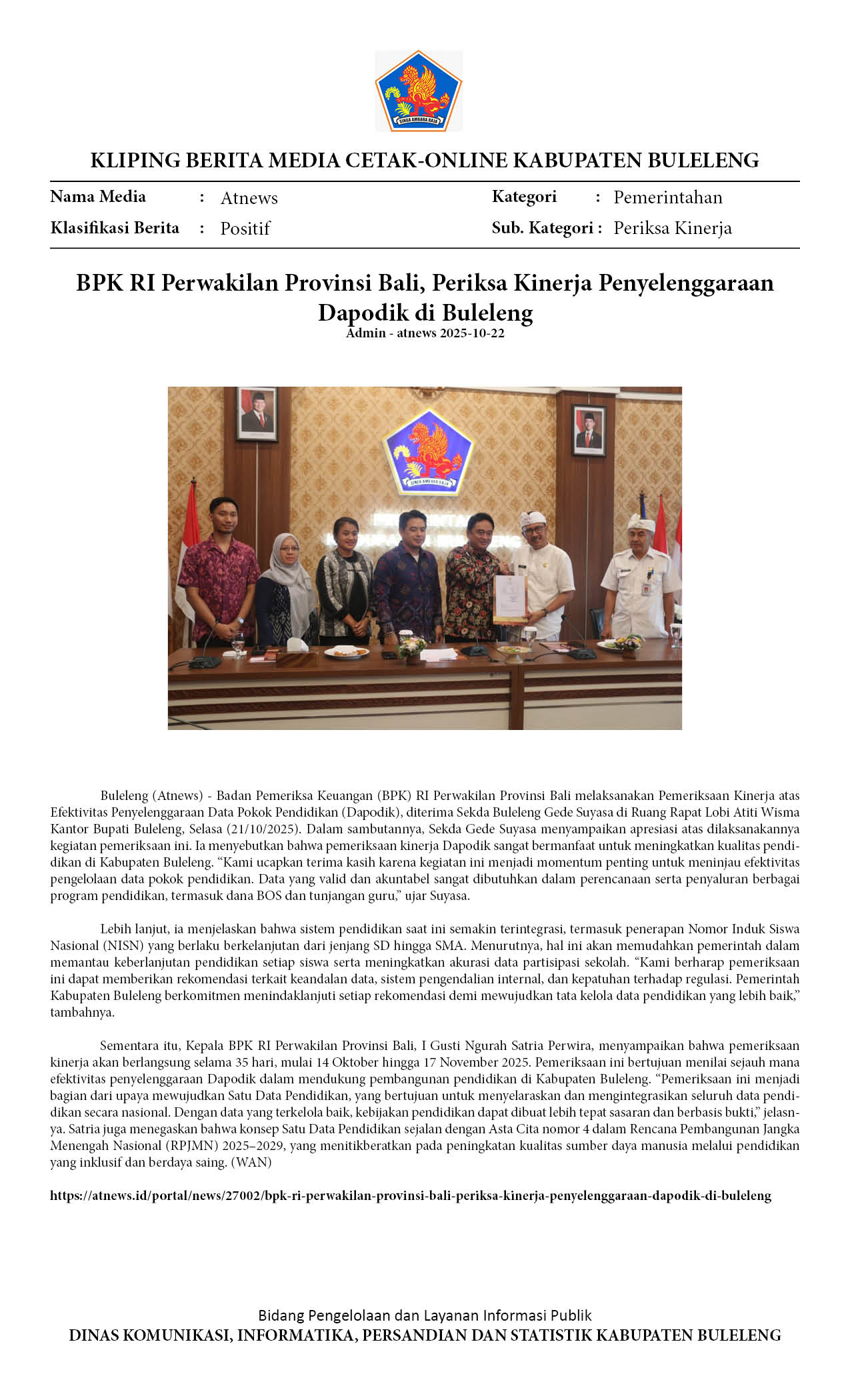 BPK RI PERWAKILAN PROVINSI BALI, PERIKSA KINERJA PENYELENGGARAAN DAPODIK DI BULELENG