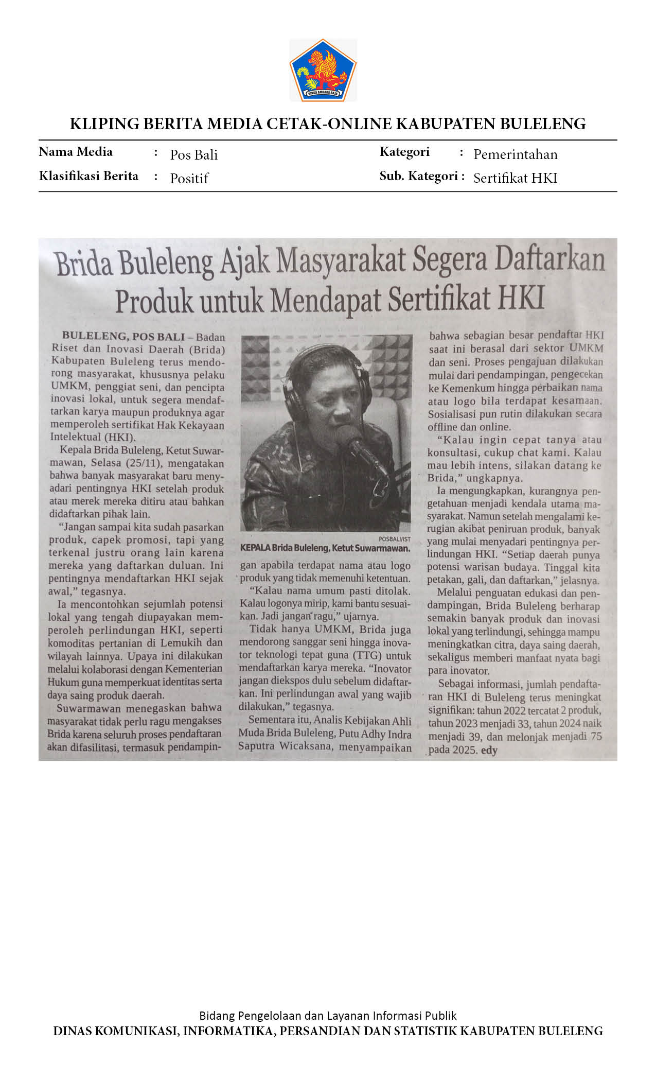 Brida Buleleng Ajak Masyarakat Segera Daftarkan Produk untuk Mendapat Sertifikat HKI