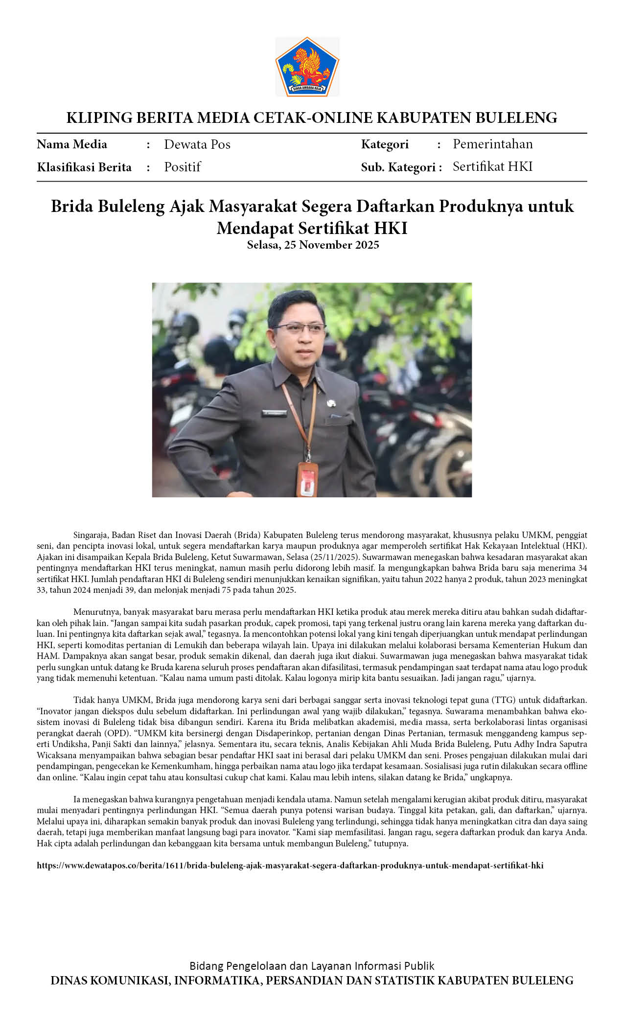 BRIDA BULELENG AJAK MASYARAKAT SEGERA DAFTARKAN PRODUKNYA UNTUK MENDAPAT SERTIFIKAT HKI