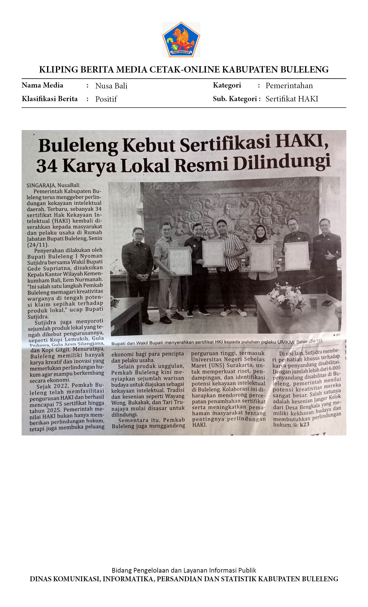 BULELENG KEBUT SERTIFIKASI HAKI, 34 KARYA LOKAL RESMI DILINDUNGI