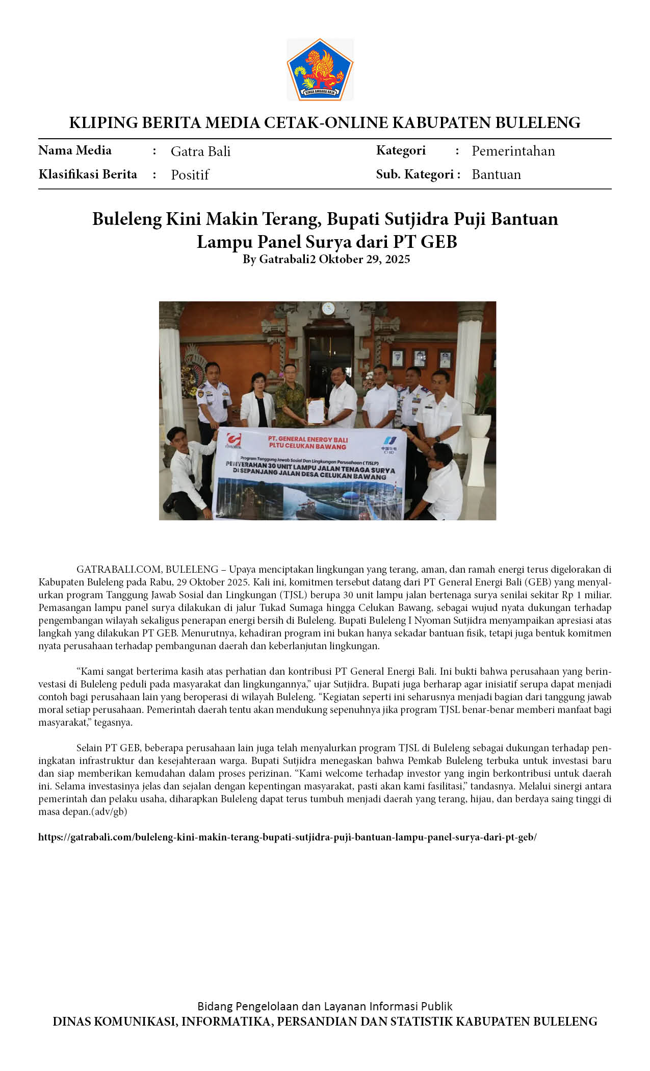 Buleleng Kini Makin Terang, Bupati Sutjidra Puji Bantuan Lampu Panel Surya dari PT GEB