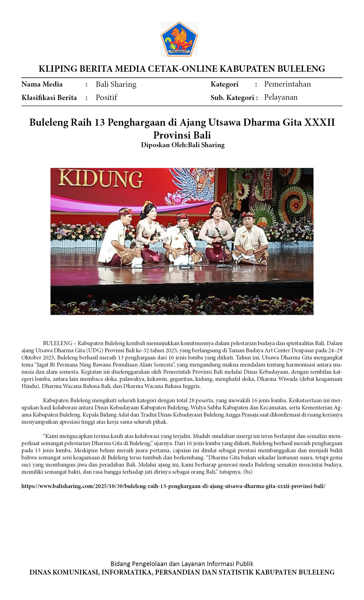 Buleleng Raih 13 Penghargaan di Ajang Utsawa Dharma Gita XXXII Provinsi Bali