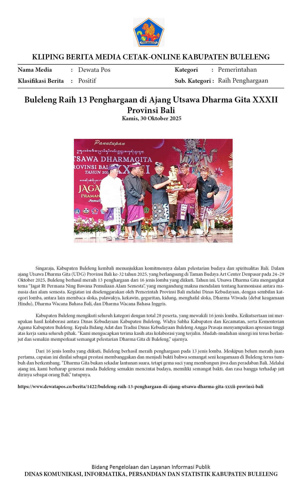 Buleleng Raih 13 Penghargaan di Ajang Utsawa Dharma Gita XXXII Provinsi Bali