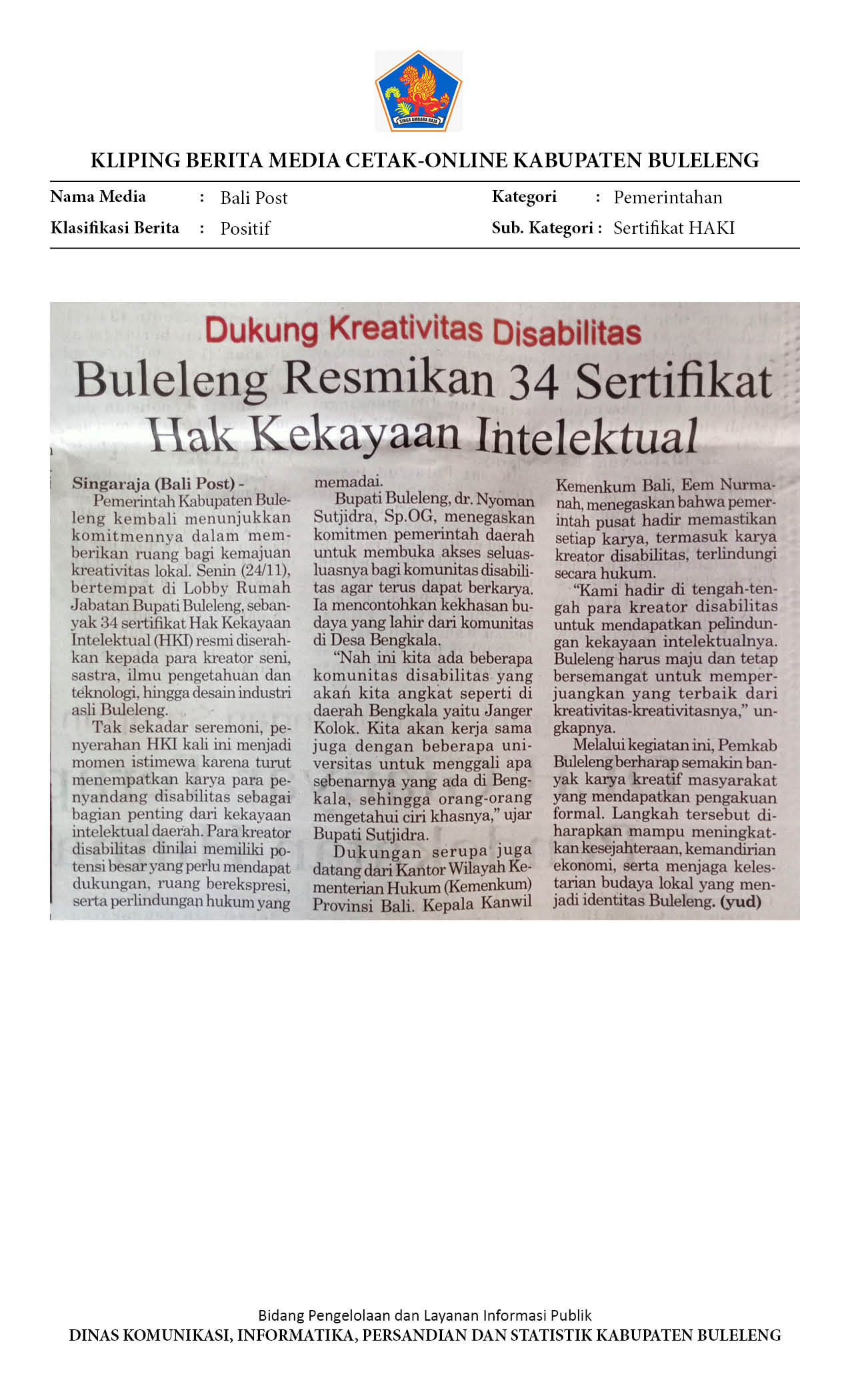 BULELENG RESMIKAN 34 SERTIFIKAT HAK KEKAYAAN INTELEKTUAL