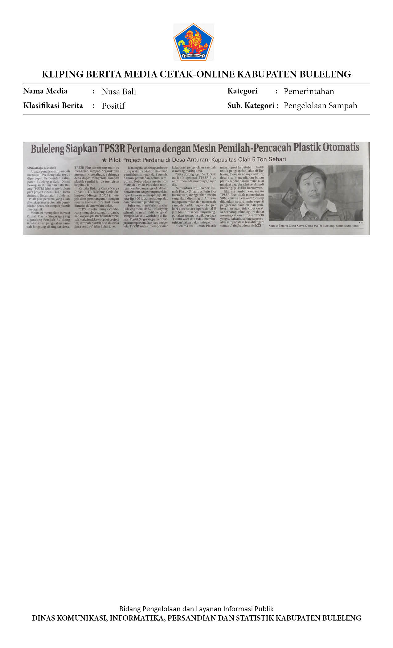 BULELENG SIAPKAN TPS3R PERTAMA DENGAN MESIN PEMILAH-PENCACAH PLASTIK OTOMATIS