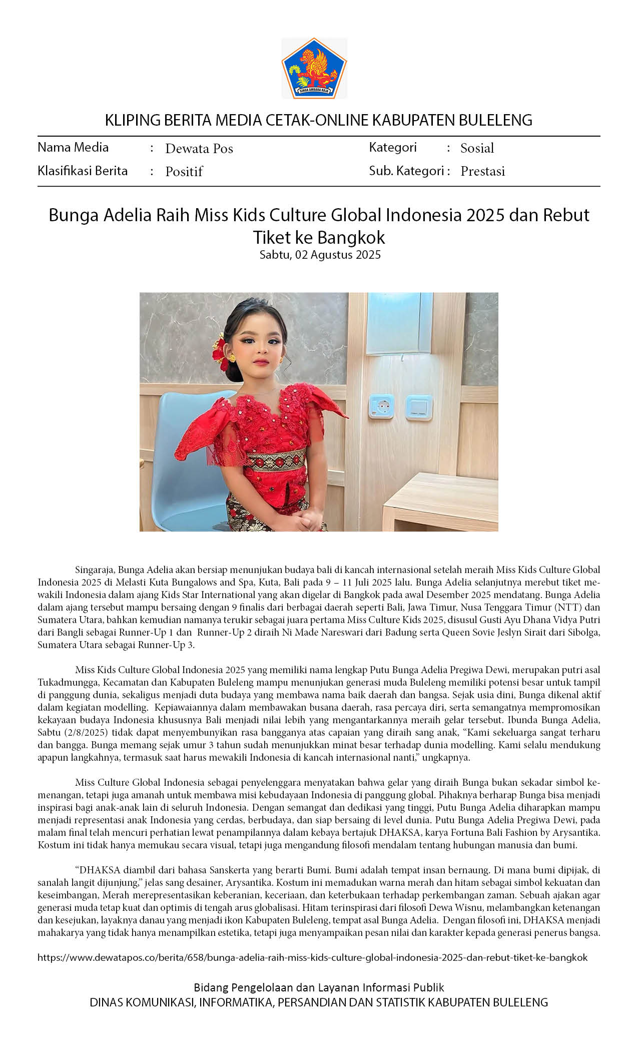 BUNGA ADELIA RAIH MISS KIDS CULTURE GLOBAL INDONESIA 2025 DAN REBUT TIKET KE BANGKOK