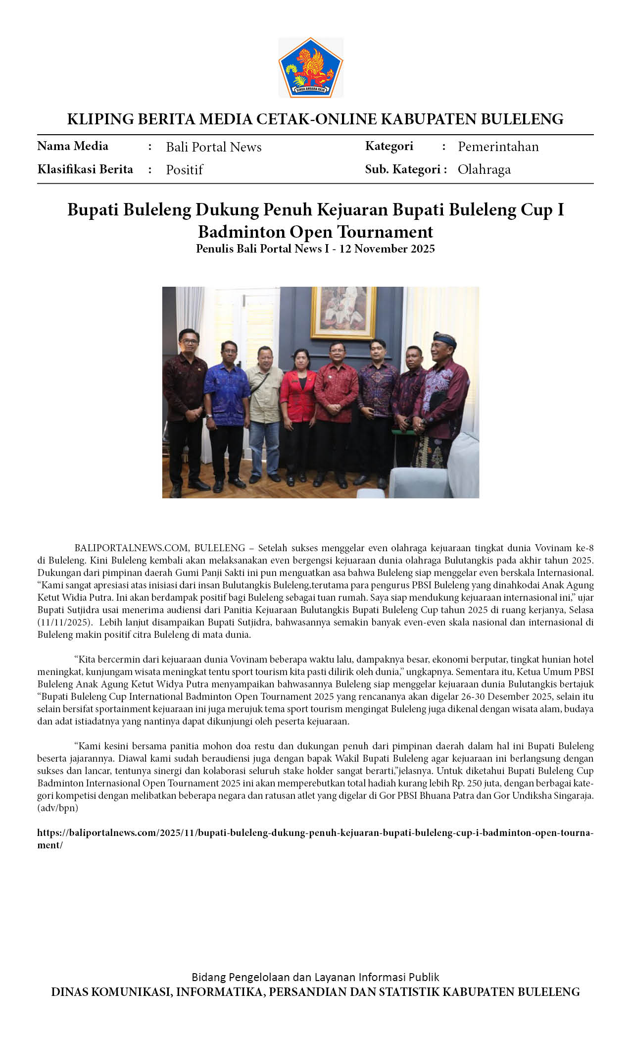 BUPATI BULELENG DUKUNG PENUH KEJUARAN BUPATI BULELENG CUP I BADMINTON OPEN TOURNAMENT