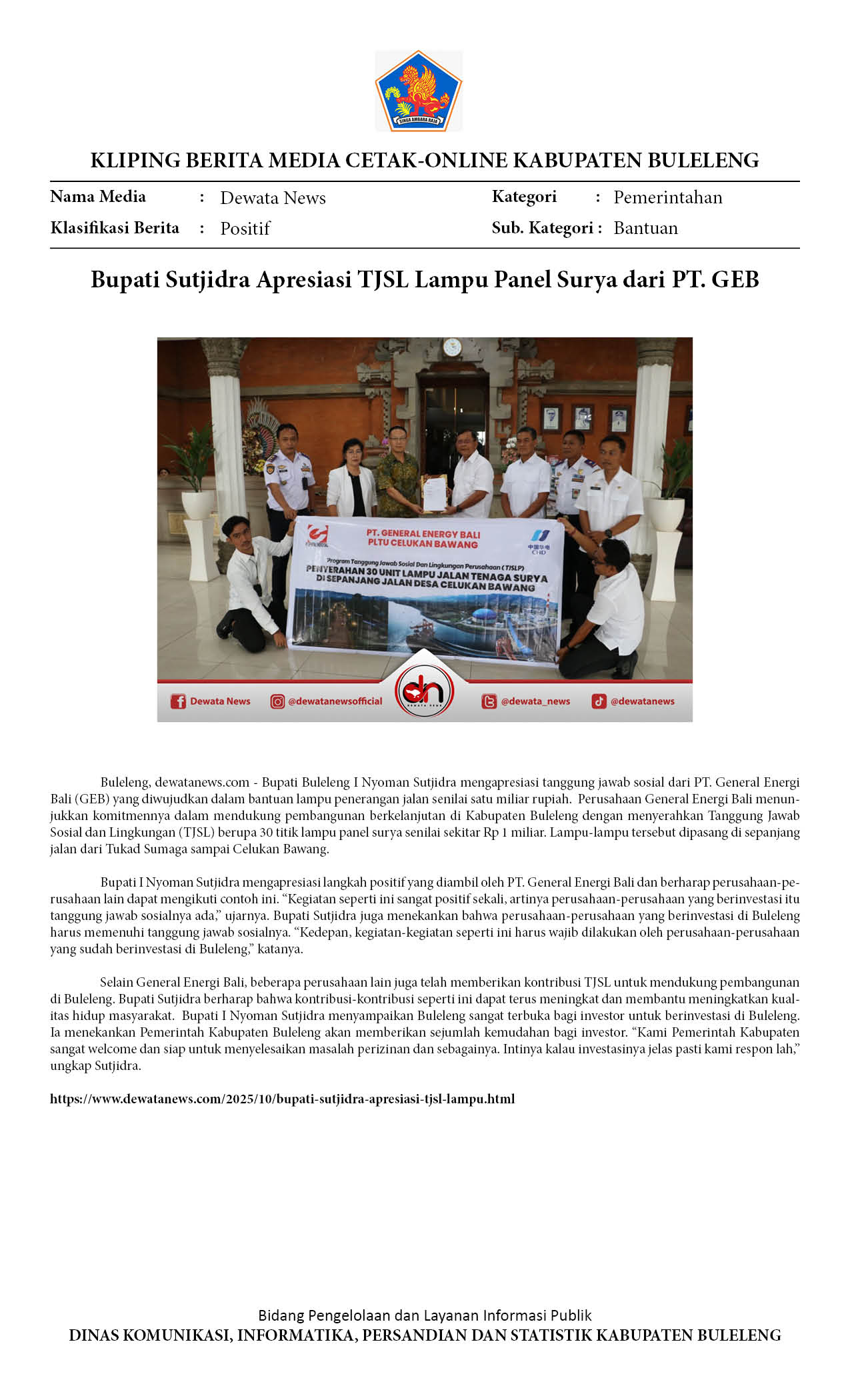 BUPATI SUTJIDRA APRESIASI TJSL LAMPU PANEL SURYA DARI PT. GEB