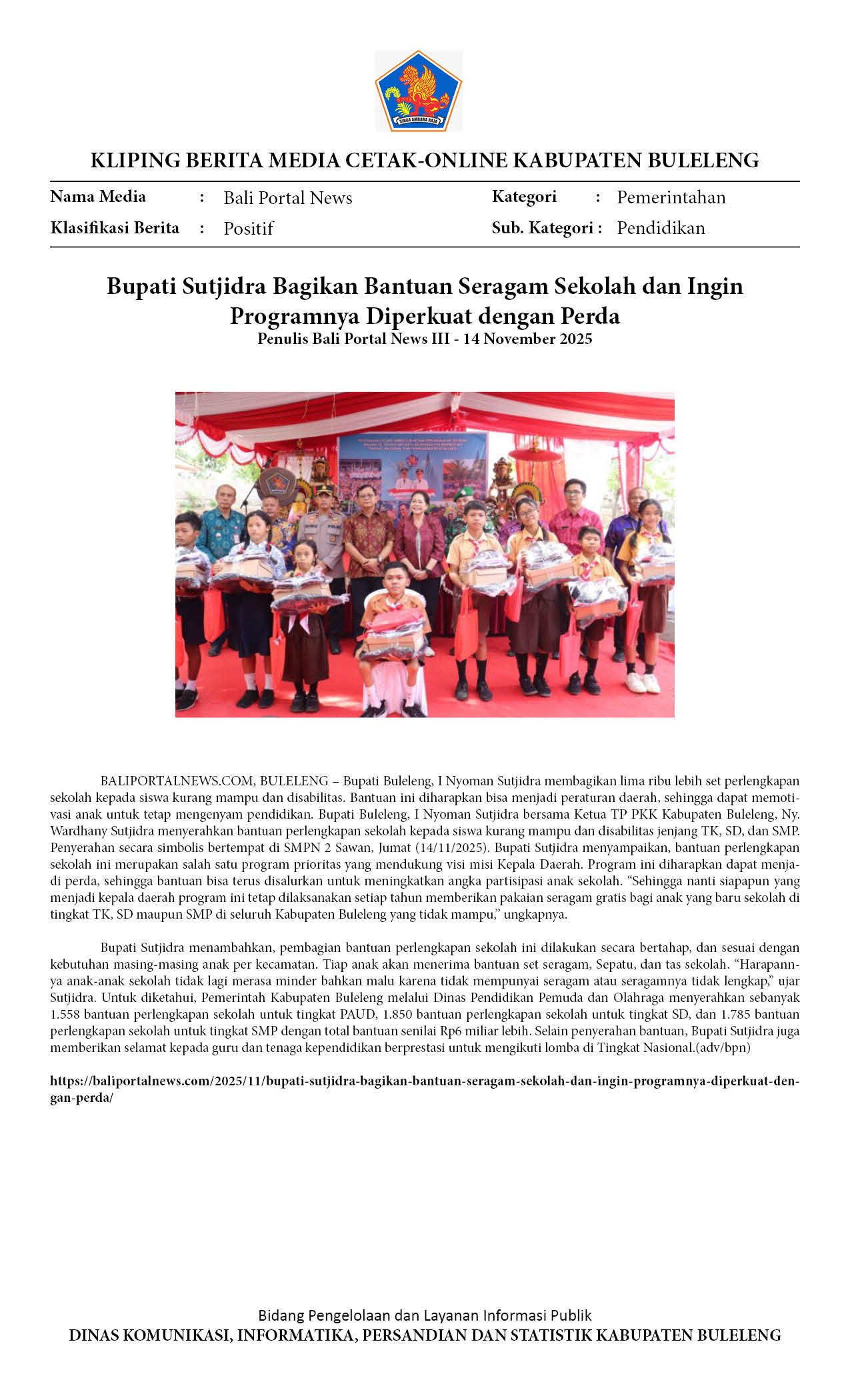 Bupati Sutjidra Bagikan Bantuan Seragam Sekolah dan Ingin Programnya Diperkuat dengan Perda