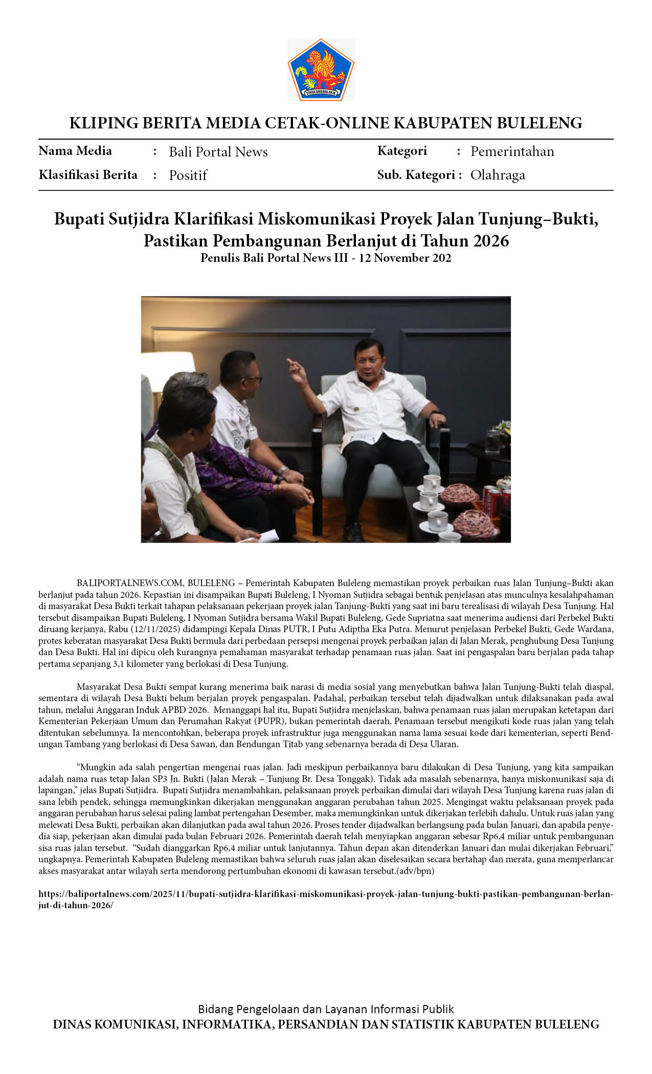 BUPATI SUTJIDRA KLARIFIKASI MISKOMUNIKASI PROYEK JALAN TUNJUNG–BUKTI, PASTIKAN PEMBANGUNAN BERLANJUT DI TAHUN 2026
