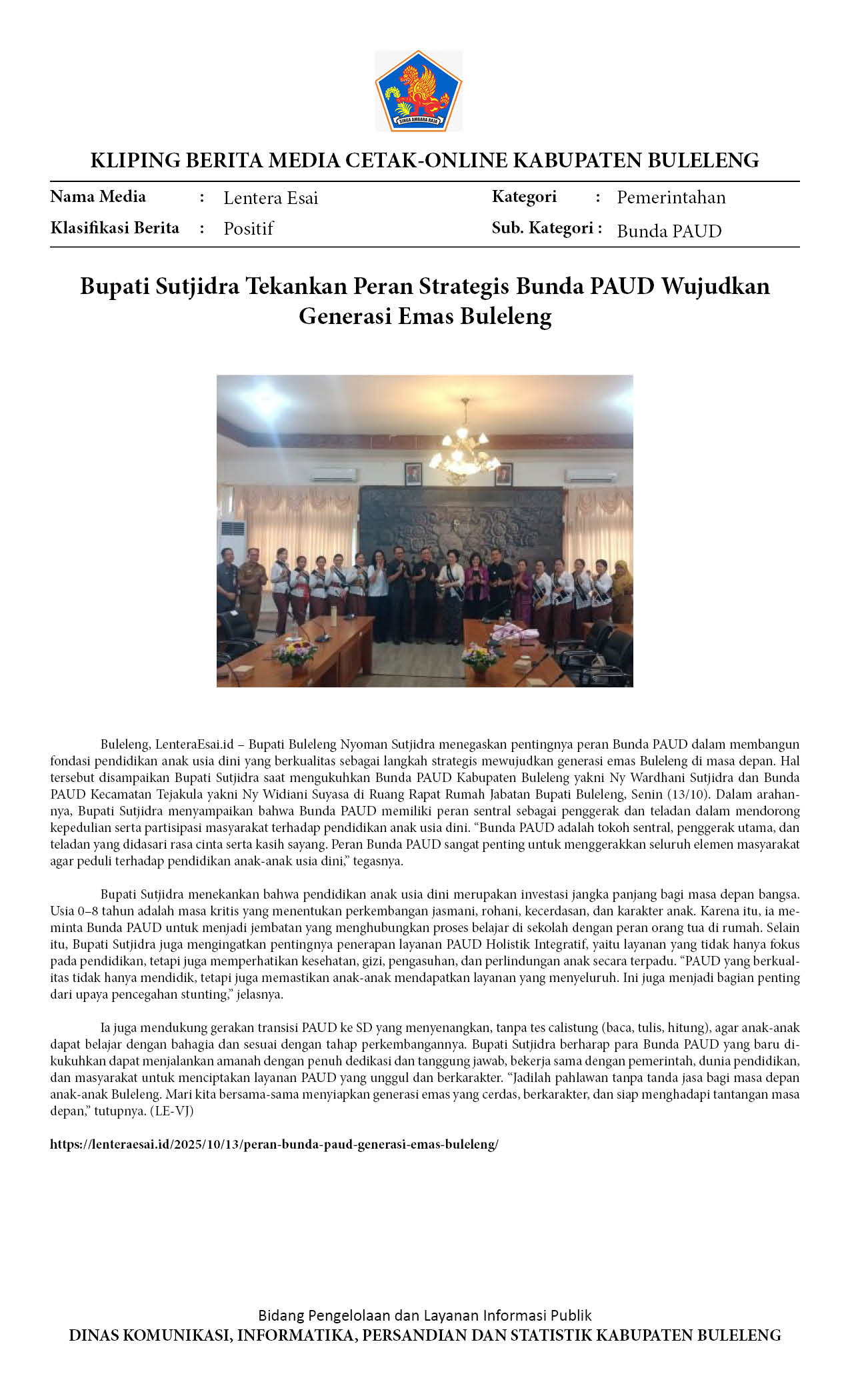 BUPATI SUTJIDRA TEKANKAN PERAN STRATEGIS BUNDA PAUD WUJUDKAN GENERASI EMAS BULELENG