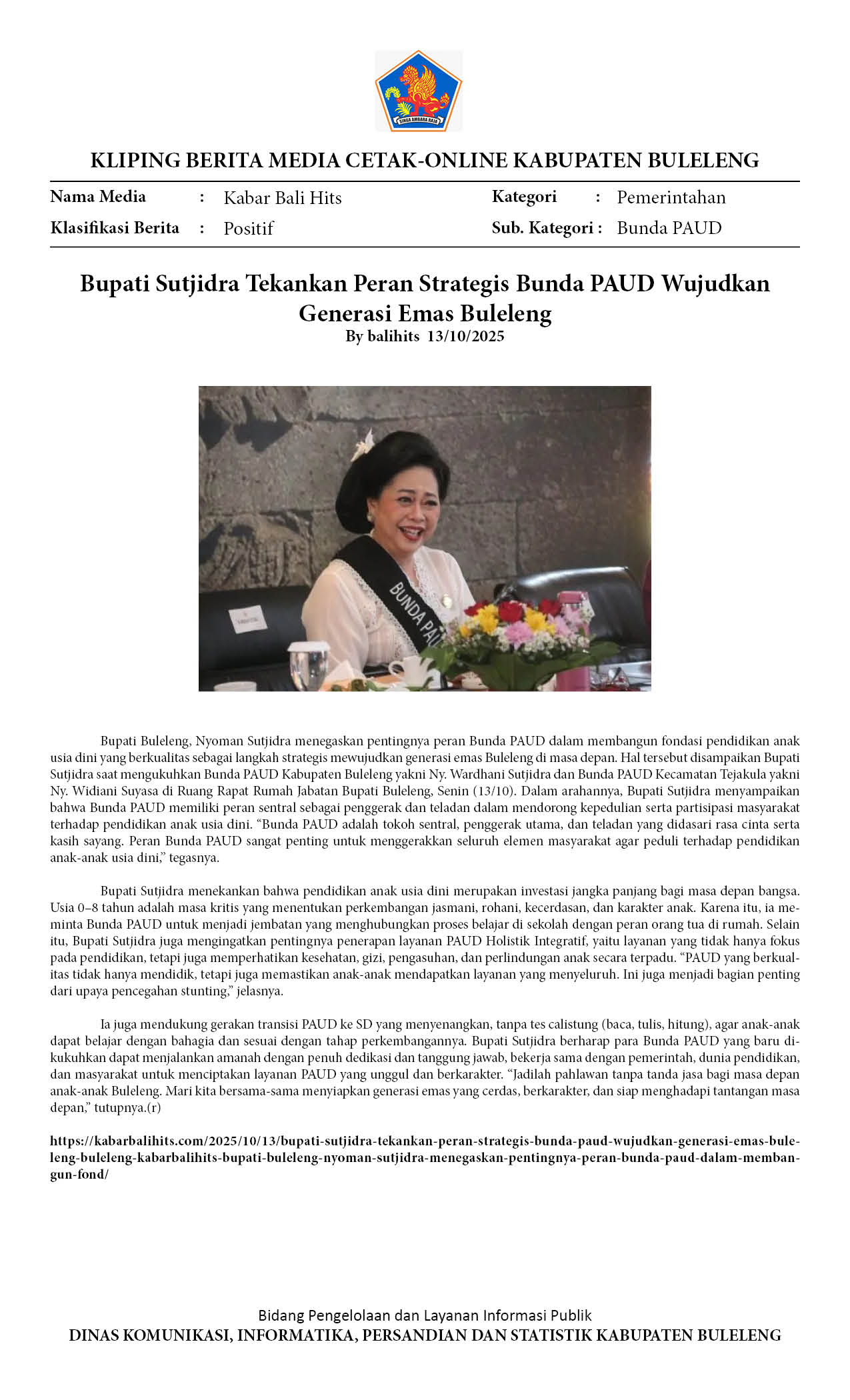 BUPATI SUTJIDRA TEKANKAN PERAN STRATEGIS BUNDA PAUD WUJUDKAN GENERASI EMAS BULELENG