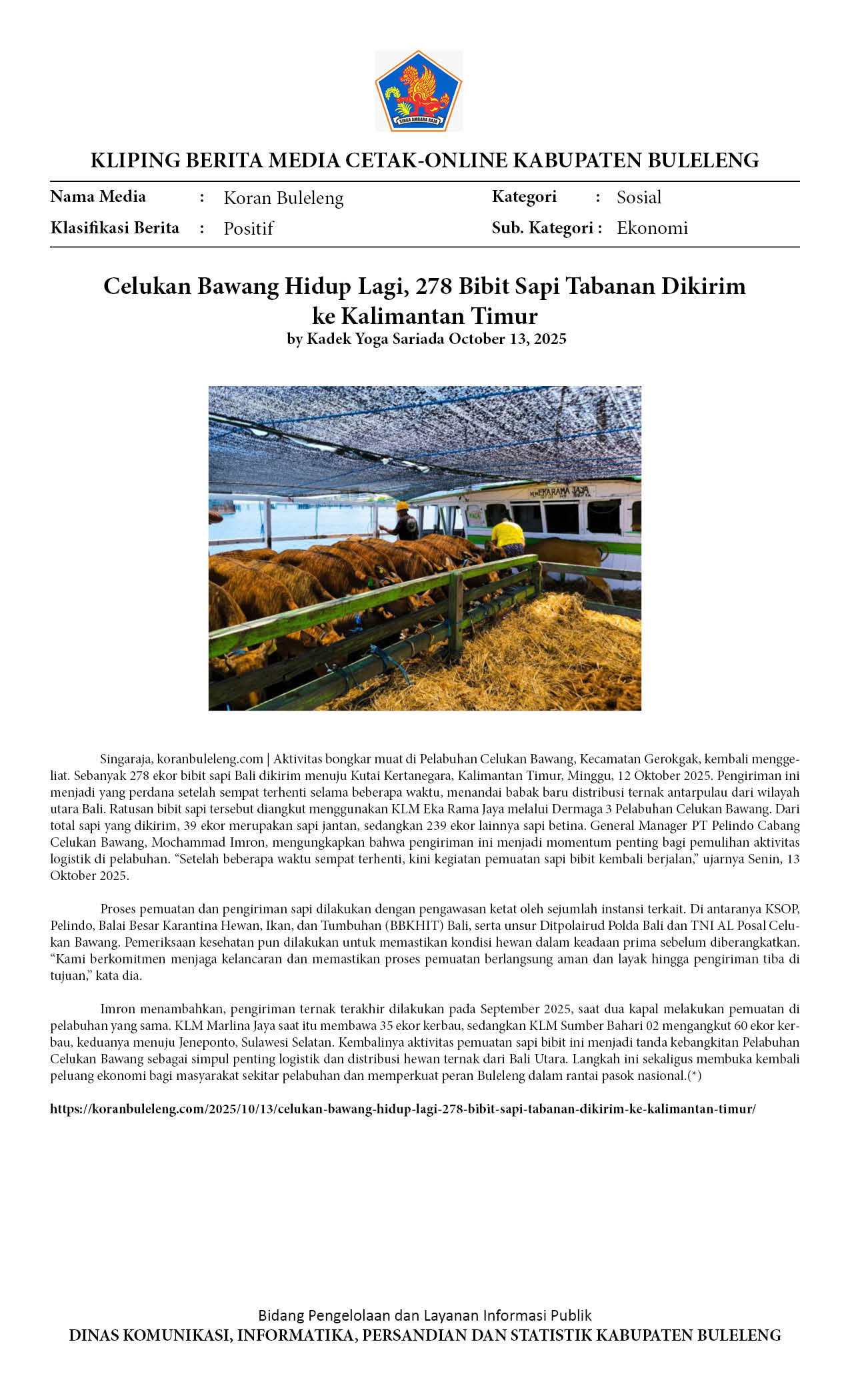 Celukan Bawang Hidup Lagi, 278 Bibit Sapi Tabanan Dikirim ke Kalimantan Timur