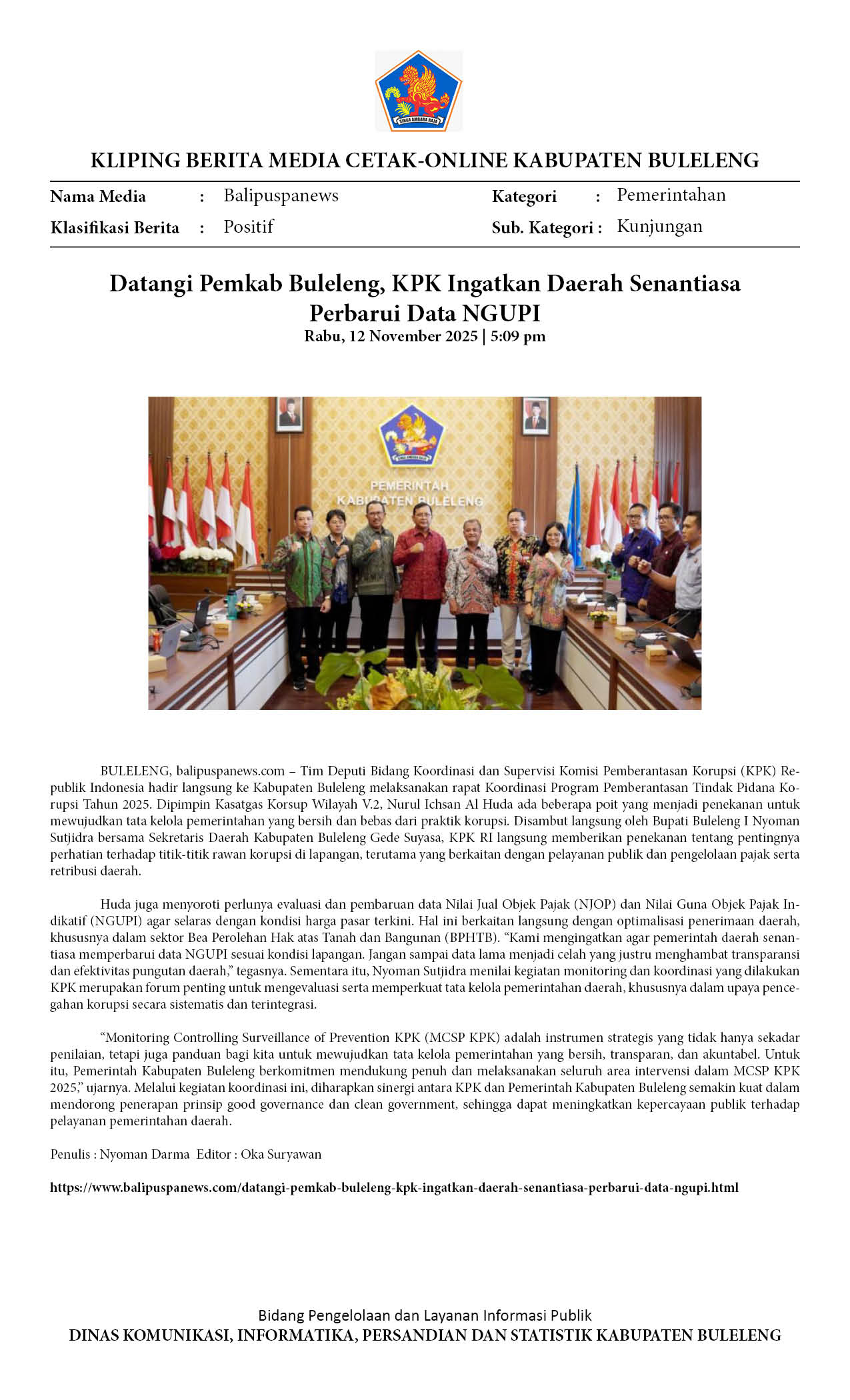 DATANGI PEMKAB BULELENG, KPK INGATKAN DAERAH SENANTIASA PERBARUI DATA NGUPI