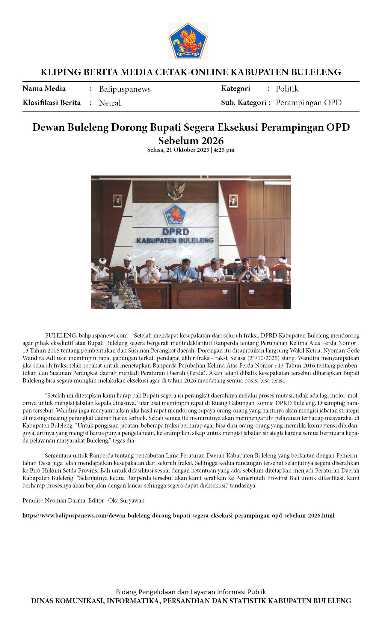DEWAN BULELENG DORONG BUPATI SEGERA EKSEKUSI PERAMPINGAN OPD SEBELUM 2026