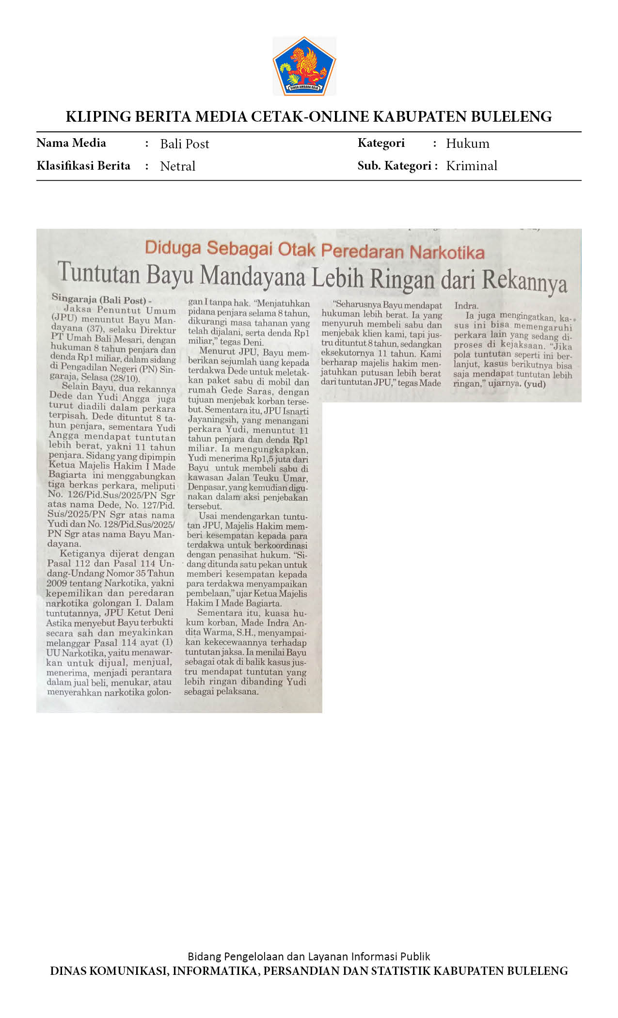 DIDUGA SEBAGAI OTAK PEREDARAN NARKOTIKA TUNTUTAN BAYU MANDAYANA LEBIH RINGAN DARI REKANNYA