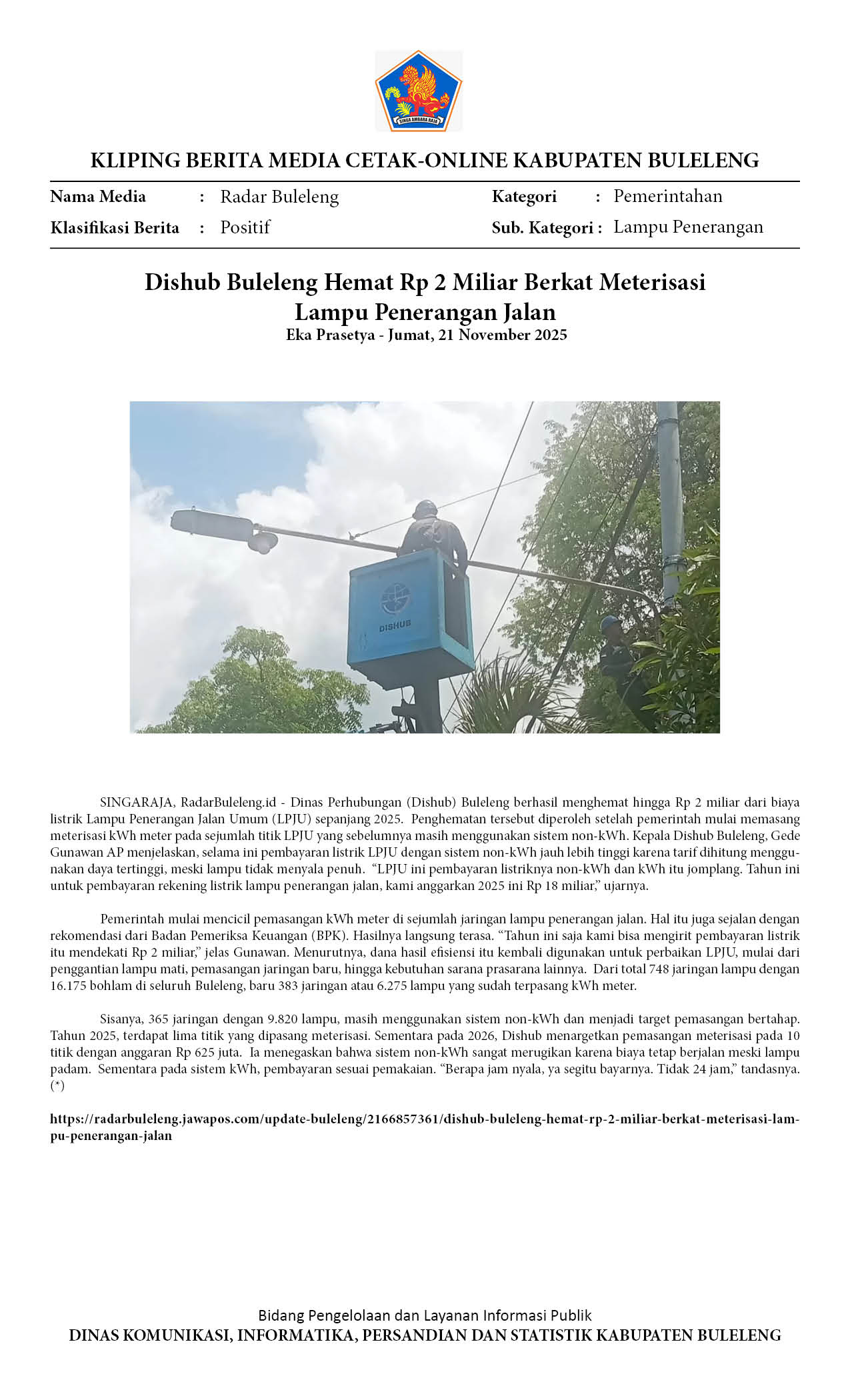 DISHUB BULELENG HEMAT RP 2 MILIAR BERKAT METERISASI LAMPU PENERANGAN JALAN