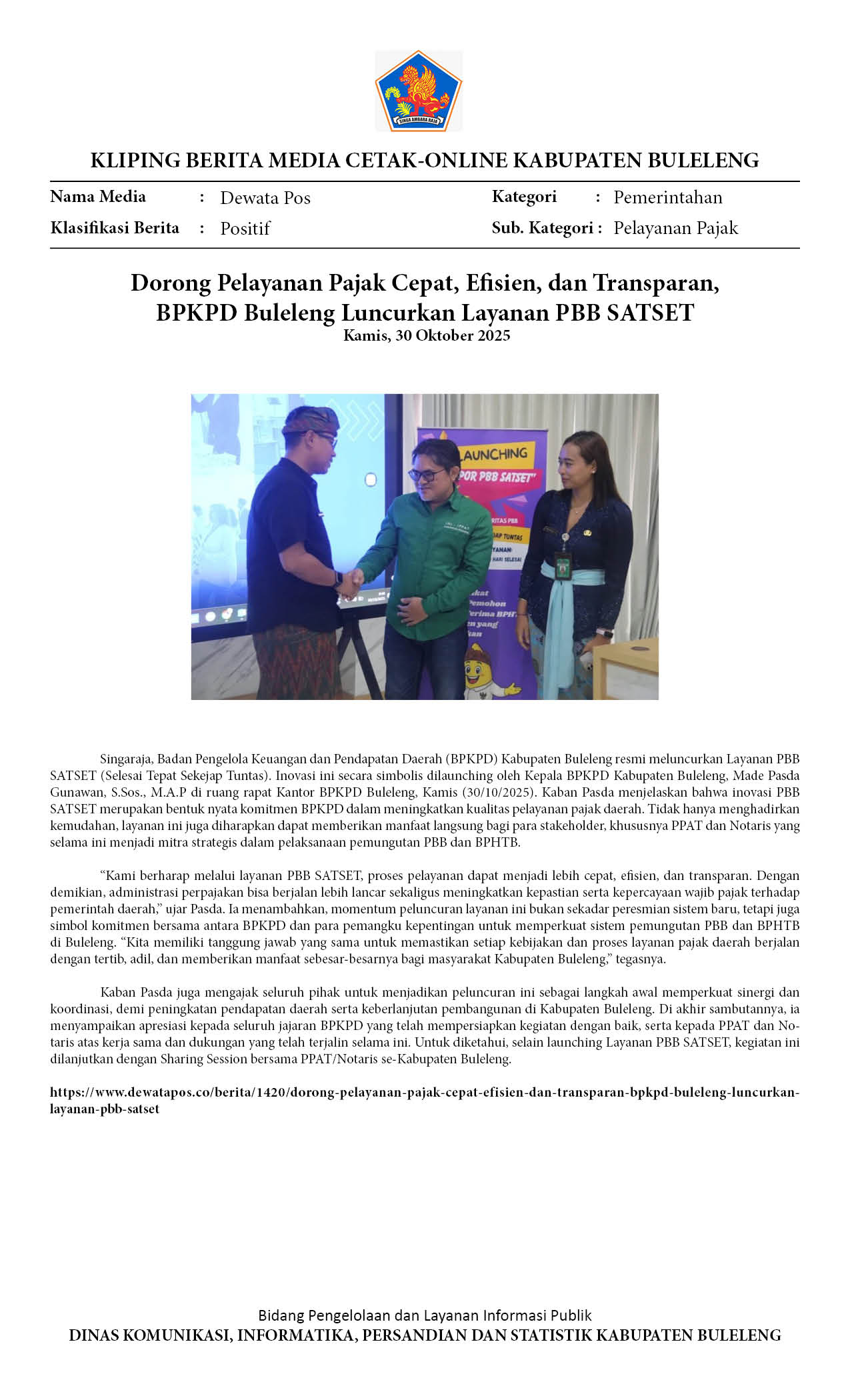 DORONG PELAYANAN PAJAK CEPAT, EFISIEN, DAN TRANSPARAN, BPKPD BULELENG LUNCURKAN LAYANAN PBB SATSET