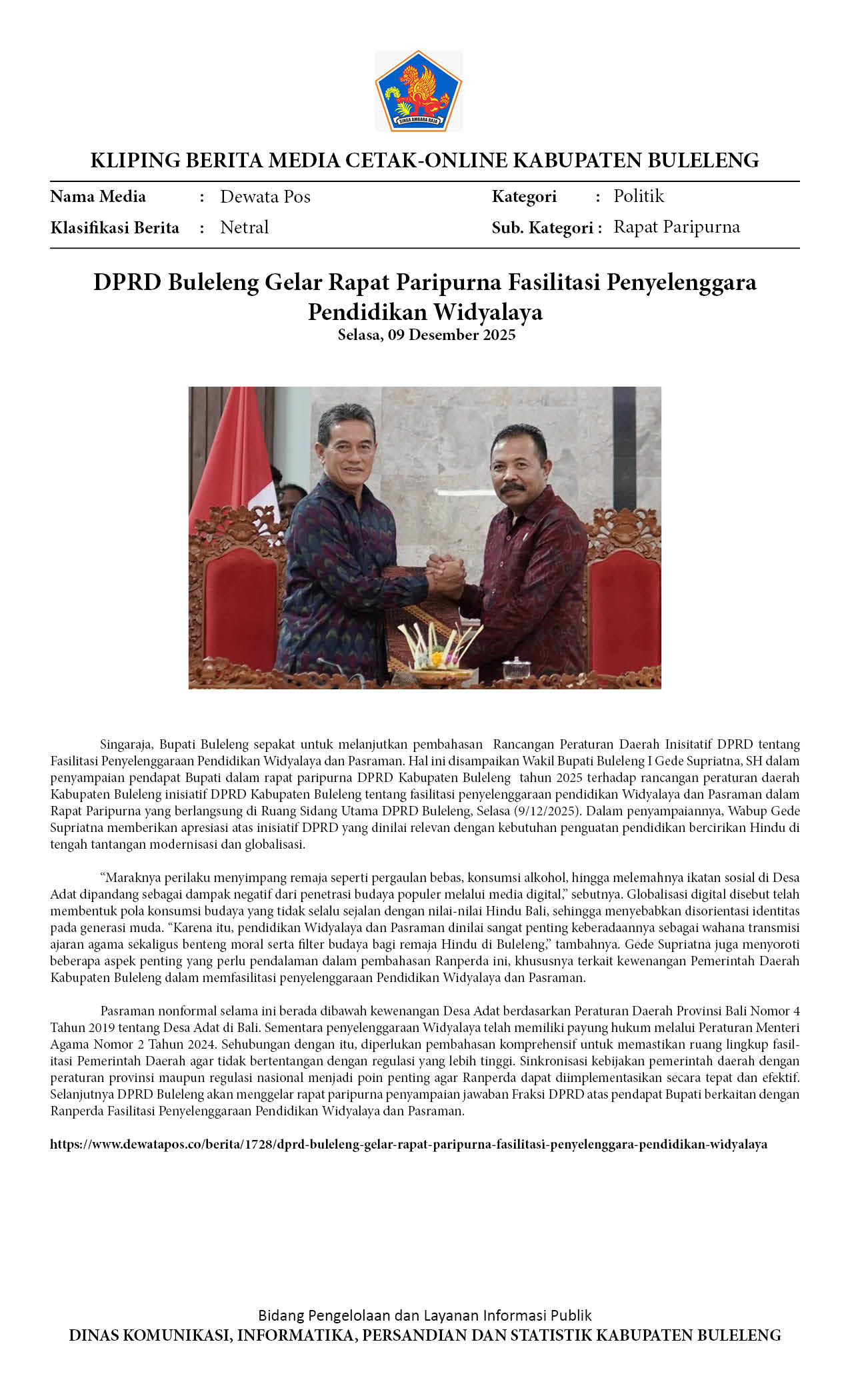 DPRD Buleleng Gelar Rapat Paripurna Fasilitasi Penyelenggara Pendidikan Widyalaya