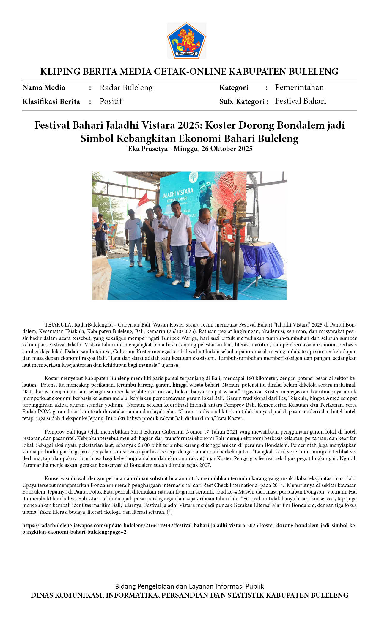 FESTIVAL BAHARI JALADHI VISTARA 2025: KOSTER DORONG BONDALEM JADI SIMBOL KEBANGKITAN EKONOMI BAHARI BULELENG