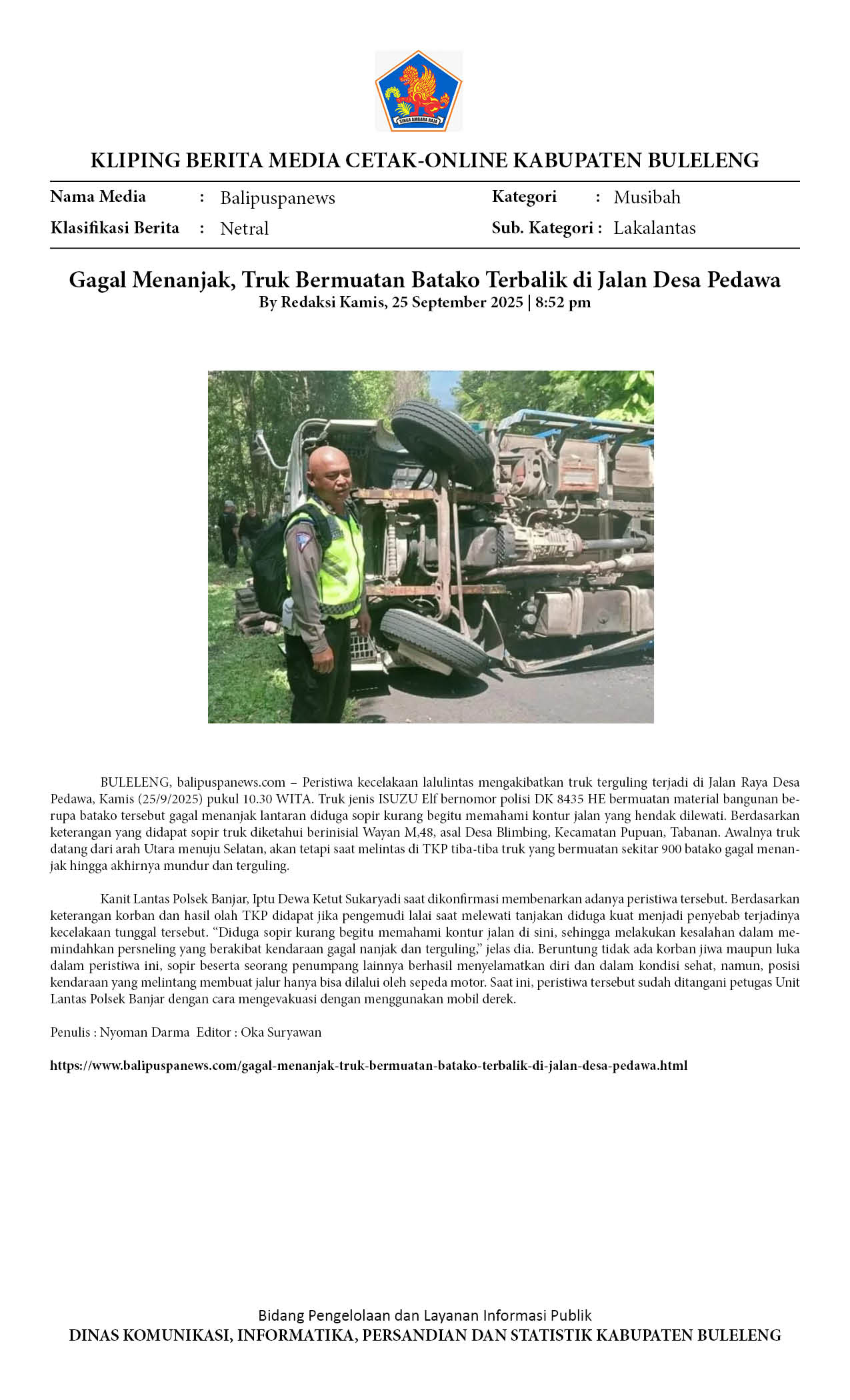 Gagal Menanjak, Truk Bermuatan Batako Terbalik di Jalan Desa Pedawa
