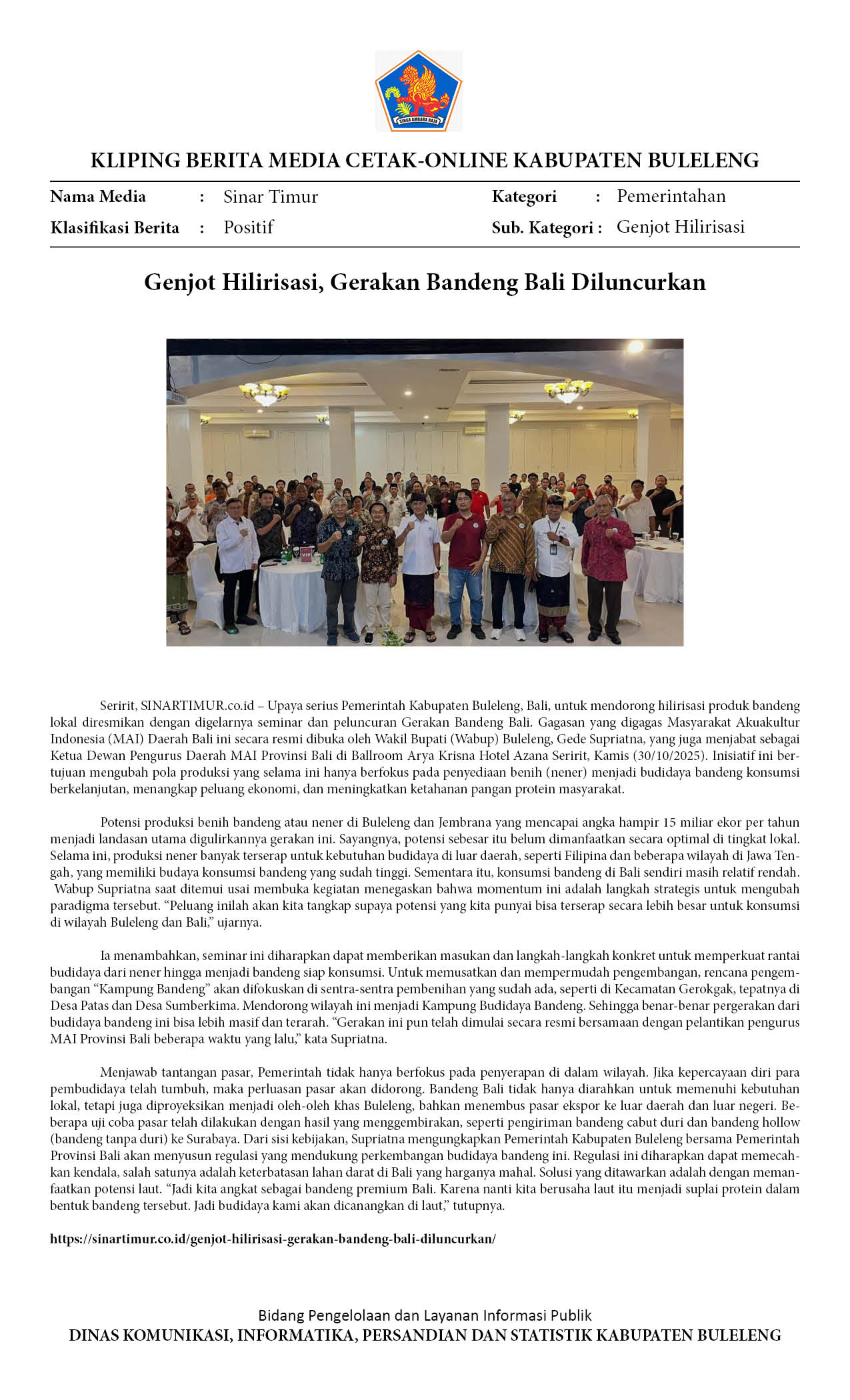 GENJOT HILIRISASI, GERAKAN BANDENG BALI DILUNCURKAN