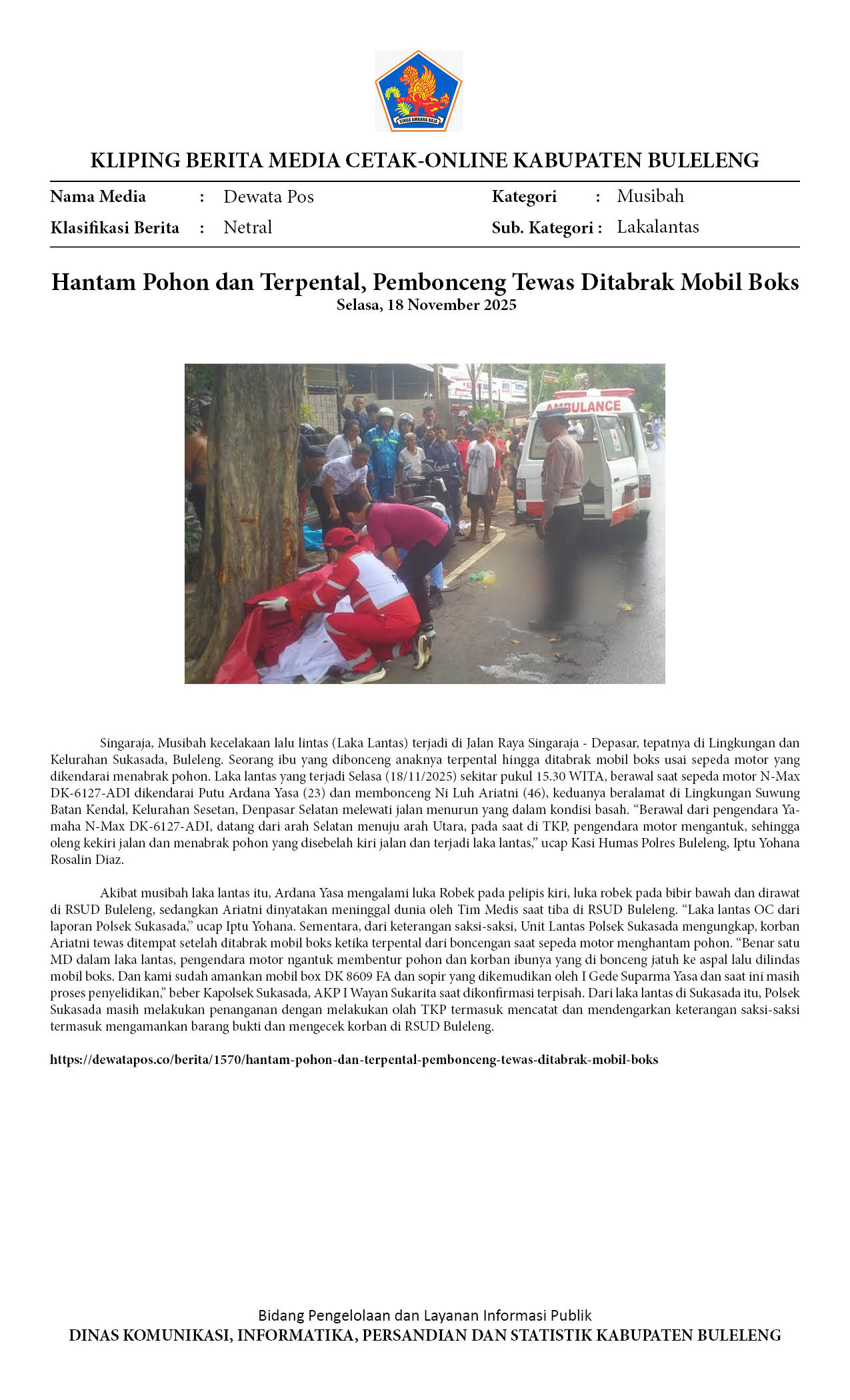 Hantam Pohon dan Terpental, Pembonceng Tewas Ditabrak Mobil Boks