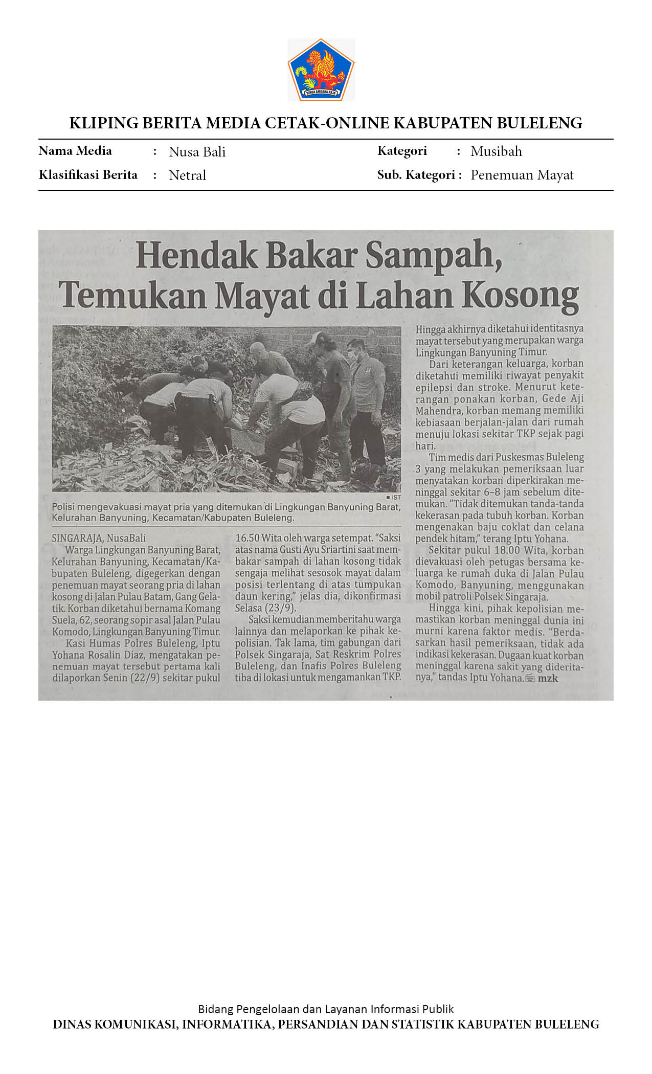 HENDAK BAKAR SAMPAH, TEMUKAN MAYAT DI LAHAN KOSONG