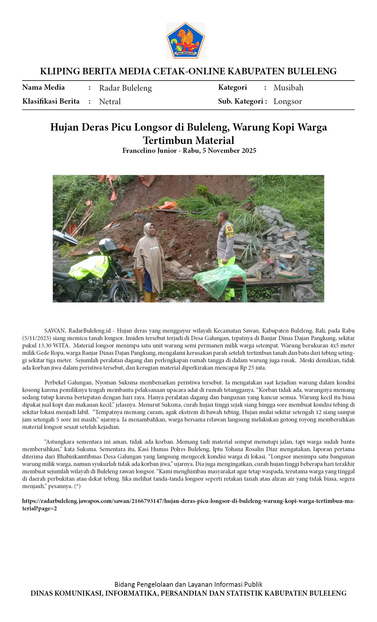 HUJAN DERAS PICU LONGSOR DI BULELENG, WARUNG KOPI WARGA TERTIMBUN MATERIAL