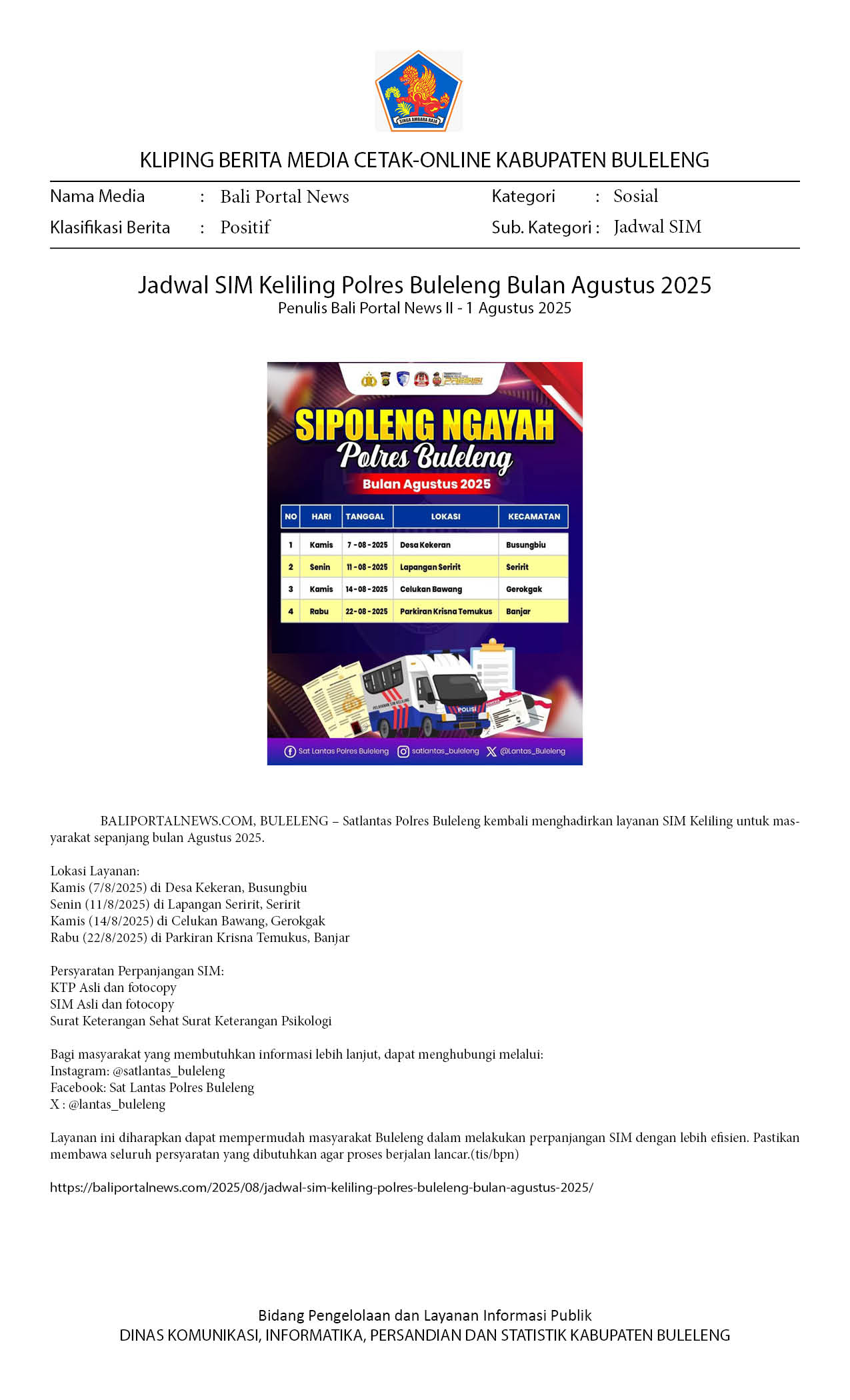 JADWAL SIM KELILING POLRES BULELENG BULAN AGUSTUS 2025