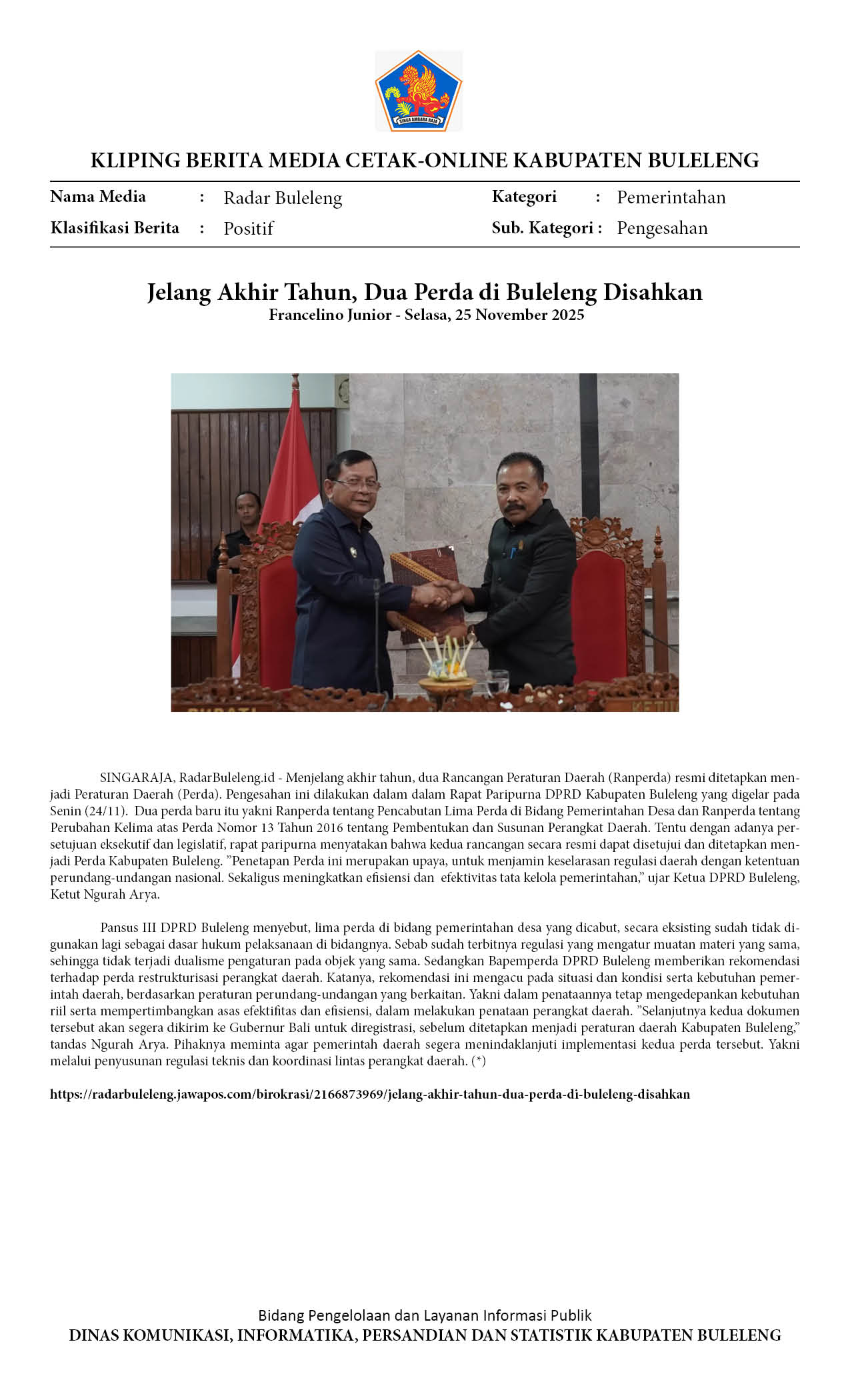 JELANG AKHIR TAHUN, DUA PERDA DI BULELENG DISAHKAN