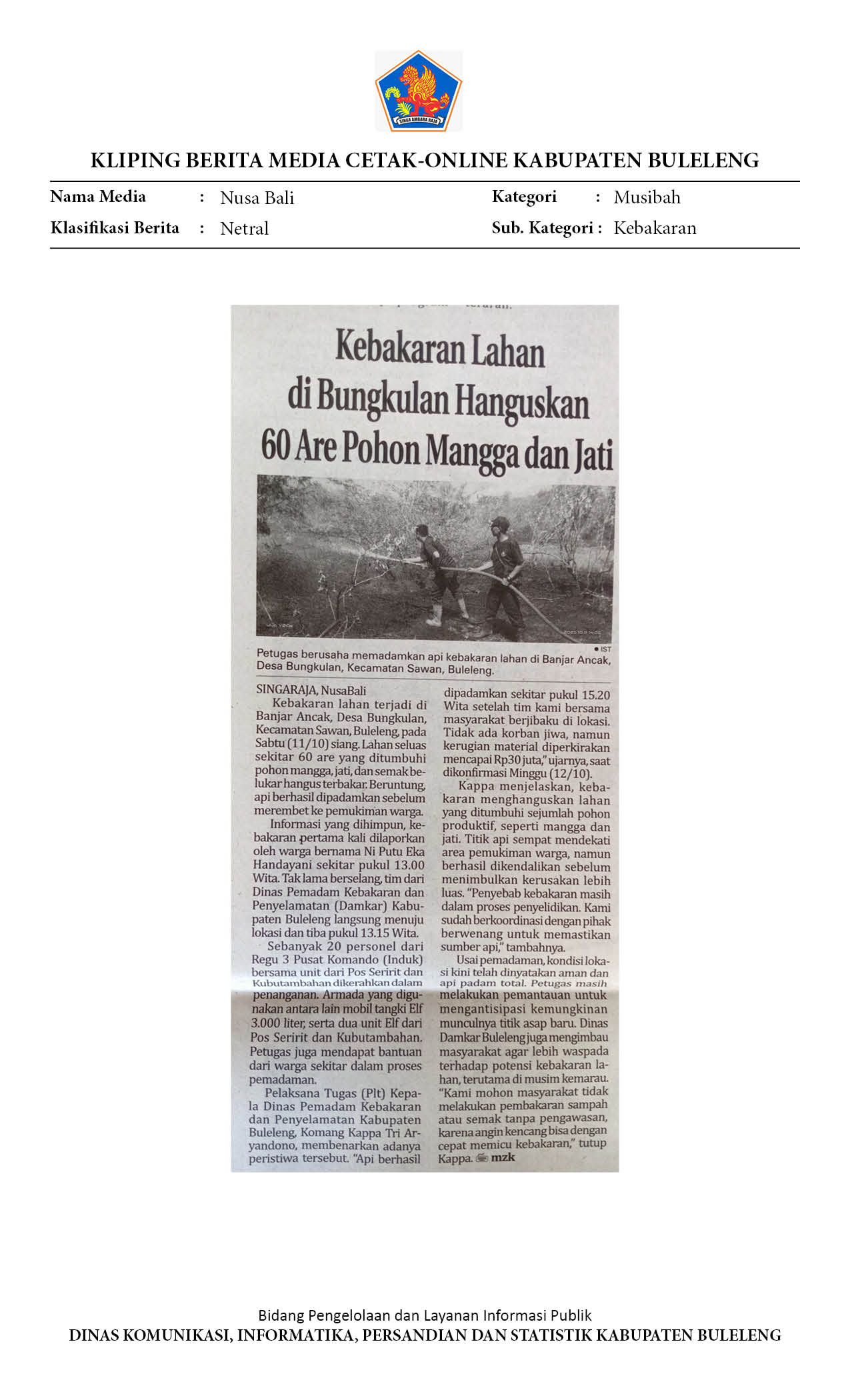 Kebakaran Lahan di Bungkulan Hanguskan 60 Are Pohon Mangga dan Jati