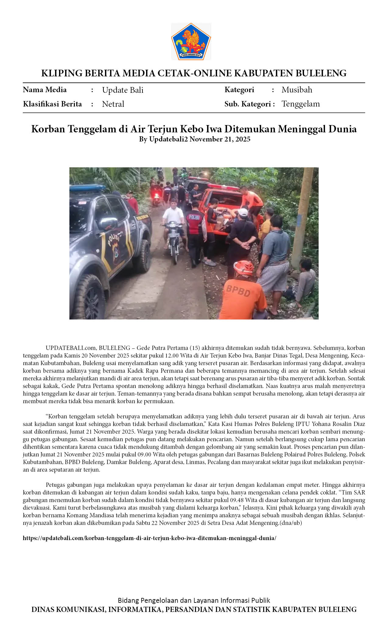 KORBAN TENGGELAM DI AIR TERJUN KEBO IWA DITEMUKAN MENINGGAL DUNIA