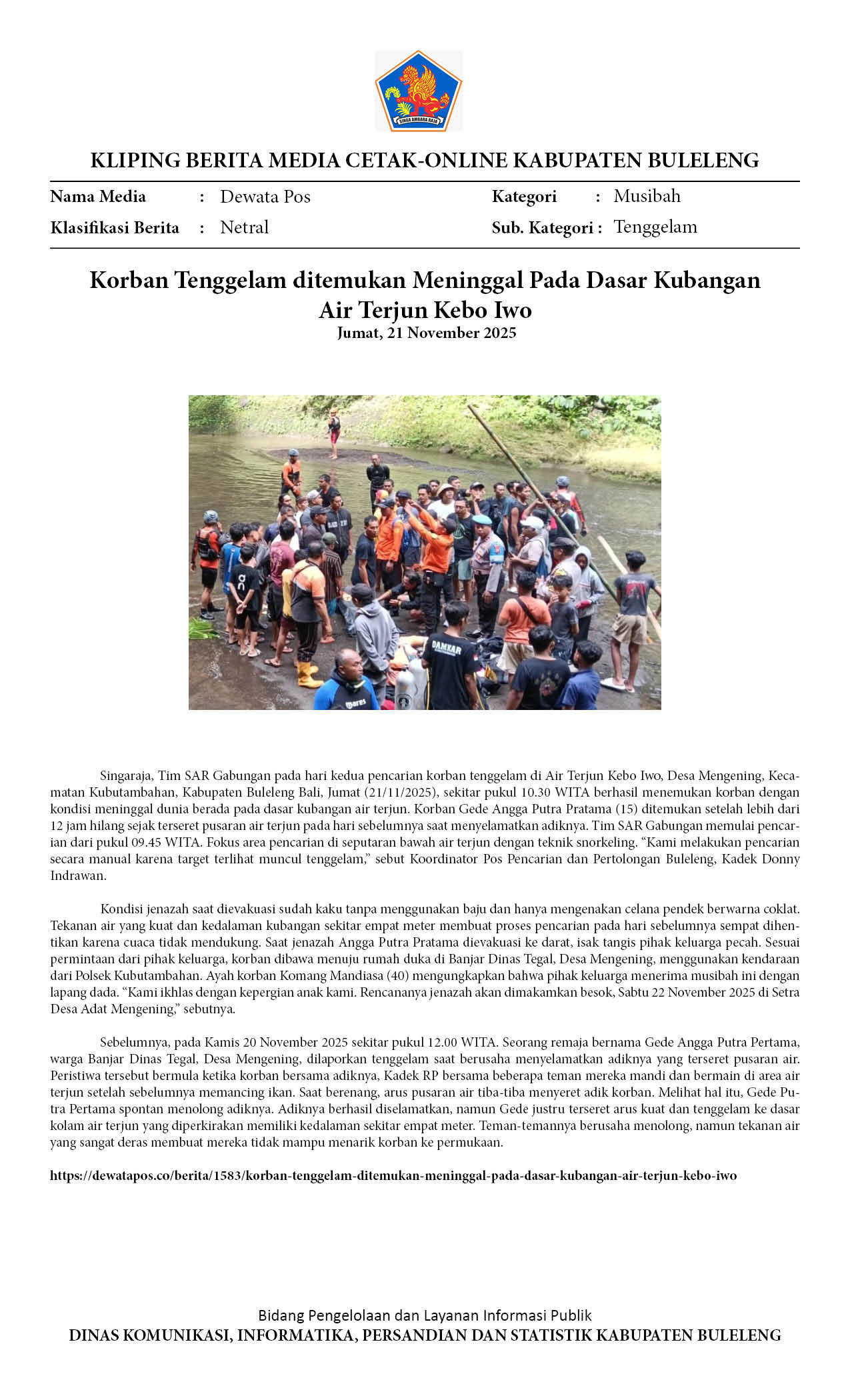 KORBAN TENGGELAM DITEMUKAN MENINGGAL PADA DASAR KUBANGAN AIR TERJUN KEBO IWO