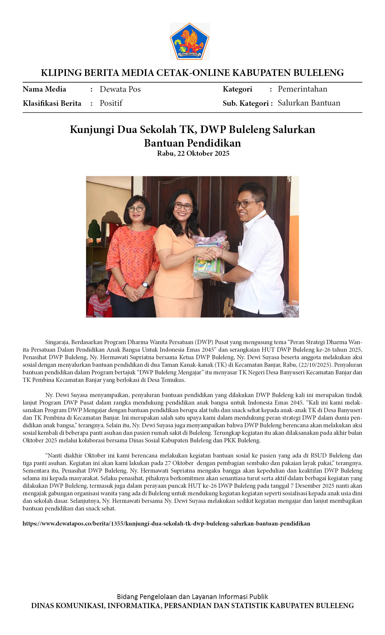 KUNJUNGI DUA SEKOLAH TK, DWP BULELENG SALURKAN BANTUAN PENDIDIKAN