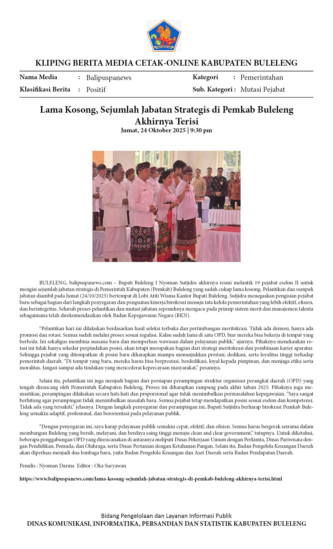 Lama Kosong, Sejumlah Jabatan Strategis di Pemkab Buleleng Akhirnya Terisi