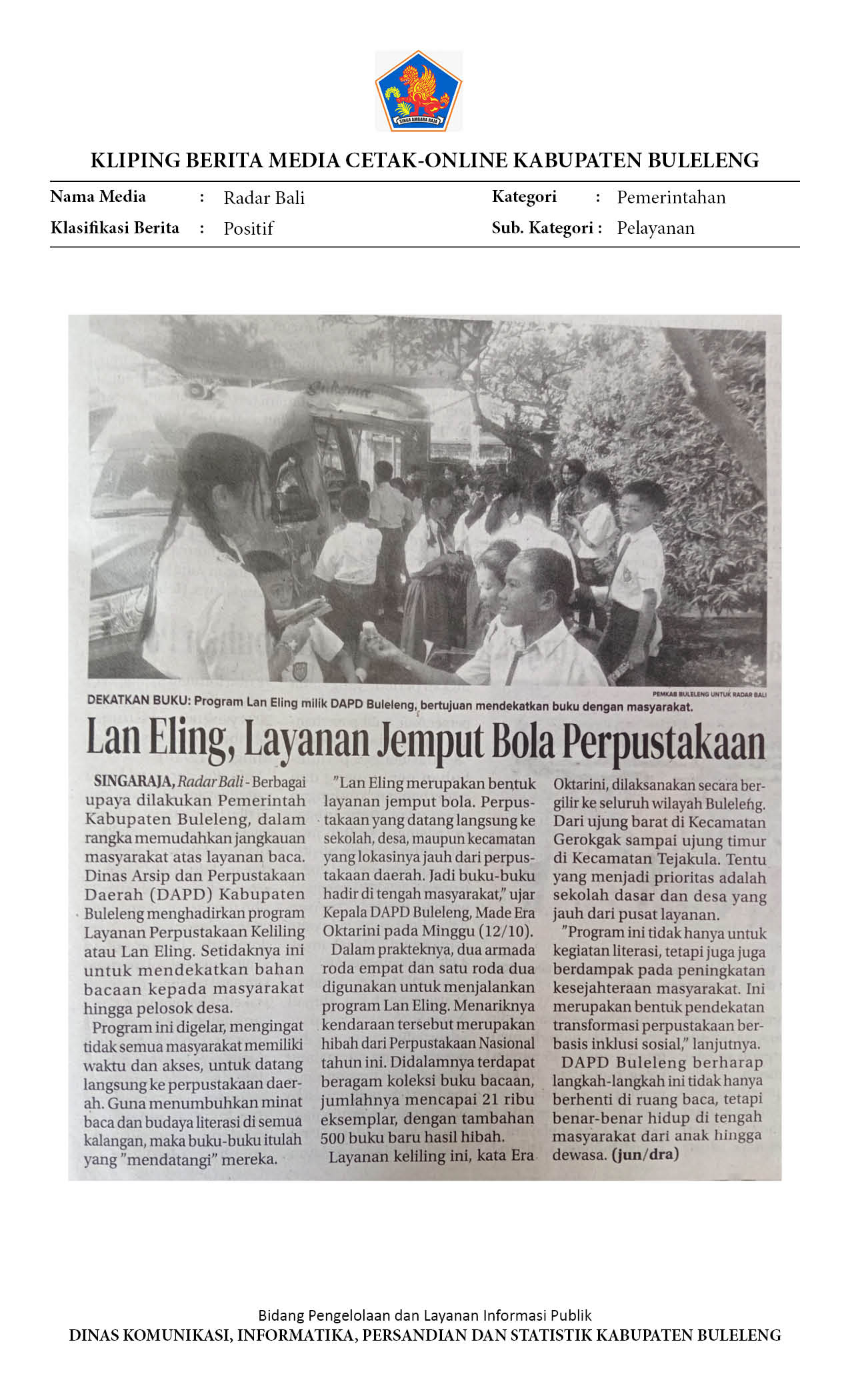 Lan Eling, Layanan Jemput Bola Perpustakaan