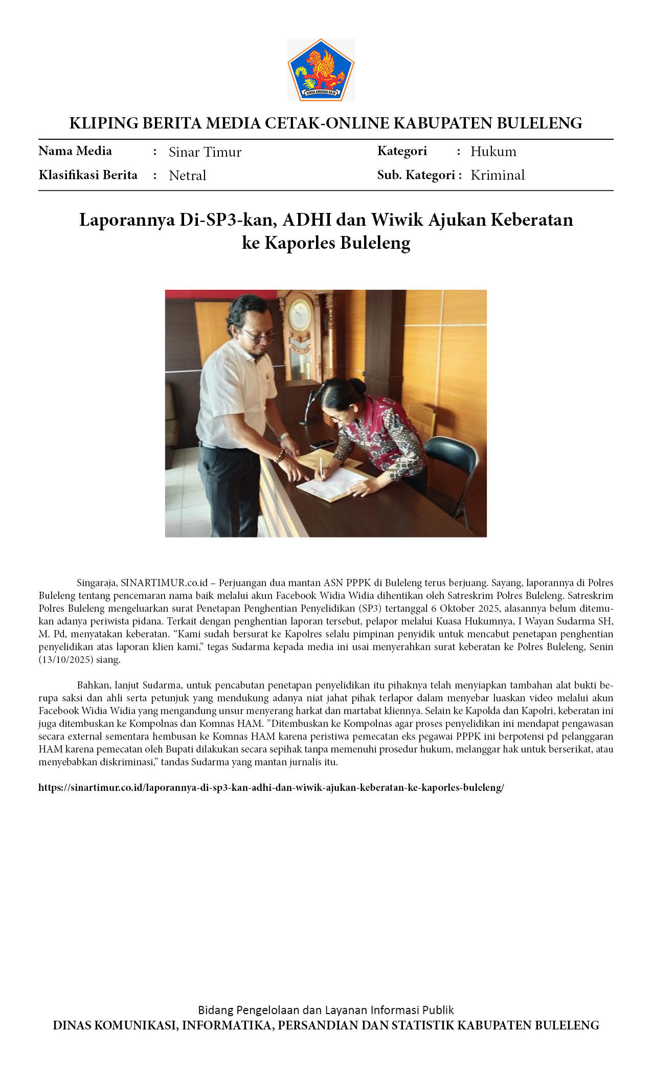 Laporannya Di-SP3-kan, ADHI dan Wiwik Ajukan Keberatan ke Kaporles Buleleng