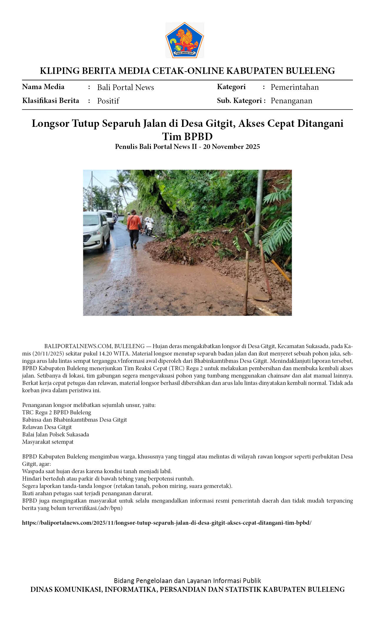 LONGSOR TUTUP SEPARUH JALAN DI DESA GITGIT, AKSES CEPAT DITANGANI TIM BPBD